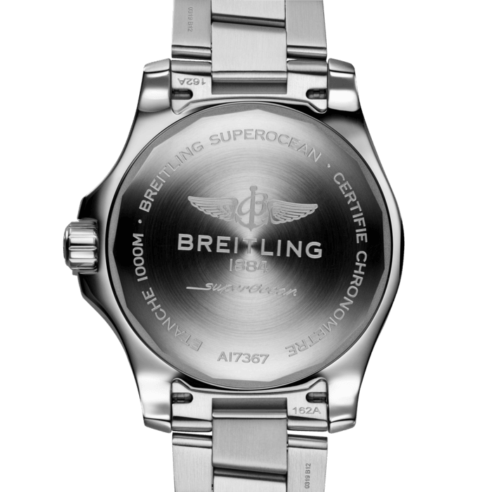 Hidden within the heart of this Breitling Superocean watch is the remarkable Breitling 17 self-winding mechanical calibre. This impressive movement is chronometer certified to be accurate to -4 to +6 seconds a day and equips the Breitling diving watch with large Superluminova coated hour and minute hands, a large red-tipped arrow shaped seconds hand, a date window at 3 o clock and a power reserve of 38 hours. The combination of the luminous dial elements, ratcheted unidirectional turning divers bezel and anti-reflective sapphire crystal glass makes it the men’s Breitling watch of choice for endurance, elegance and easy legibility.