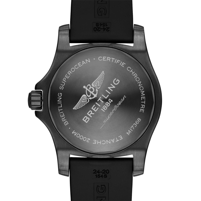 Hidden within the heart of this Breitling Superocean Automatic 46 watch and protected by a closed case back engraved with the Breitling logo is the remarkable Breitling 17 self-winding mechanical calibre. This impressive movement is chronometer certified to be accurate to -4 to +6 seconds a day and equips the Breitling diving watch with large Superluminova coated hour and minute hands, a large red-tipped arrow shaped seconds hand and a power reserve of 38 hours. The combination of luminous dial elements, ratcheted unidirectional turning divers bezel and anti-reflective sapphire crystal glass makes this Superocean Automatic 46 the men’s Breitling watch of choice for endurance, adventure and easy legibility.