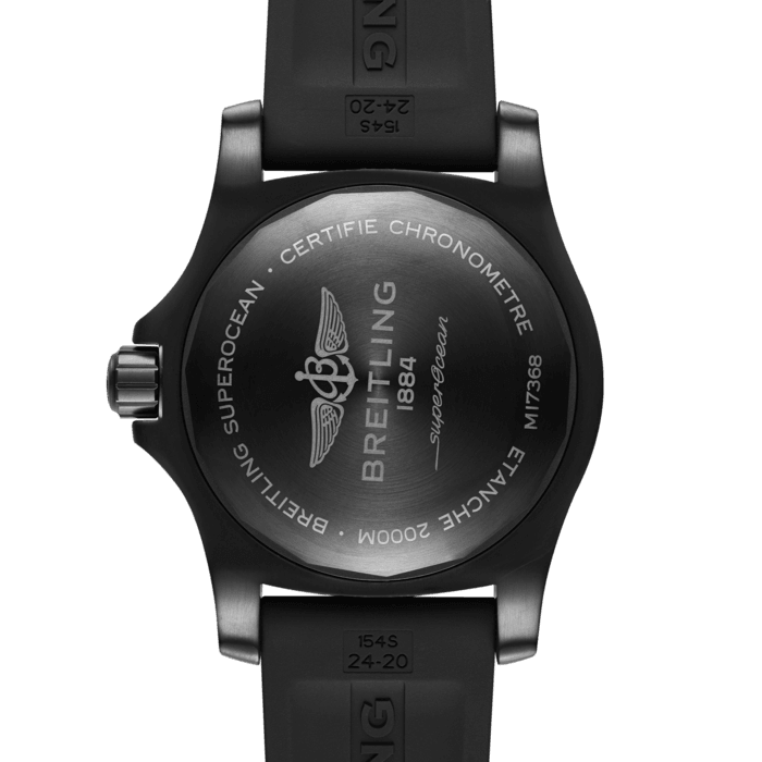 Hidden within the heart of this Breitling Superocean watch is the remarkable Breitling 17 self-winding mechanical calibre. This impressive movement is chronometer certified to be accurate to -4 to +6 seconds a day and equips the Breitling diving watch with large Superluminova coated hour and minute hands, a large red-tipped arrow shaped seconds hand, a date window at 3 o clock and a power reserve of 38 hours. The combination of the luminous dial elements, ratcheted unidirectional turning divers bezel and anti-reflective sapphire crystal glass makes it the men’s Breitling watch of choice for endurance, elegance and easy legibility.