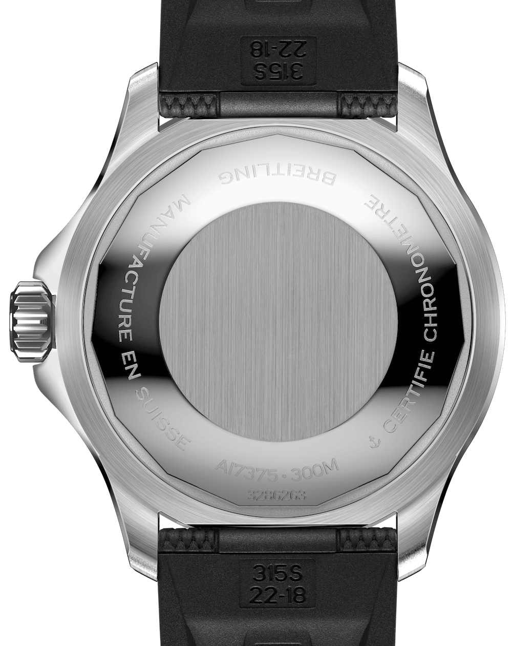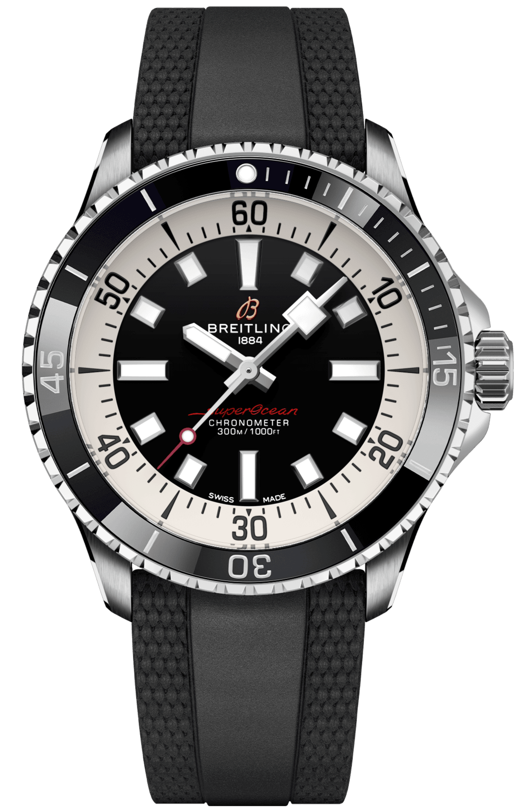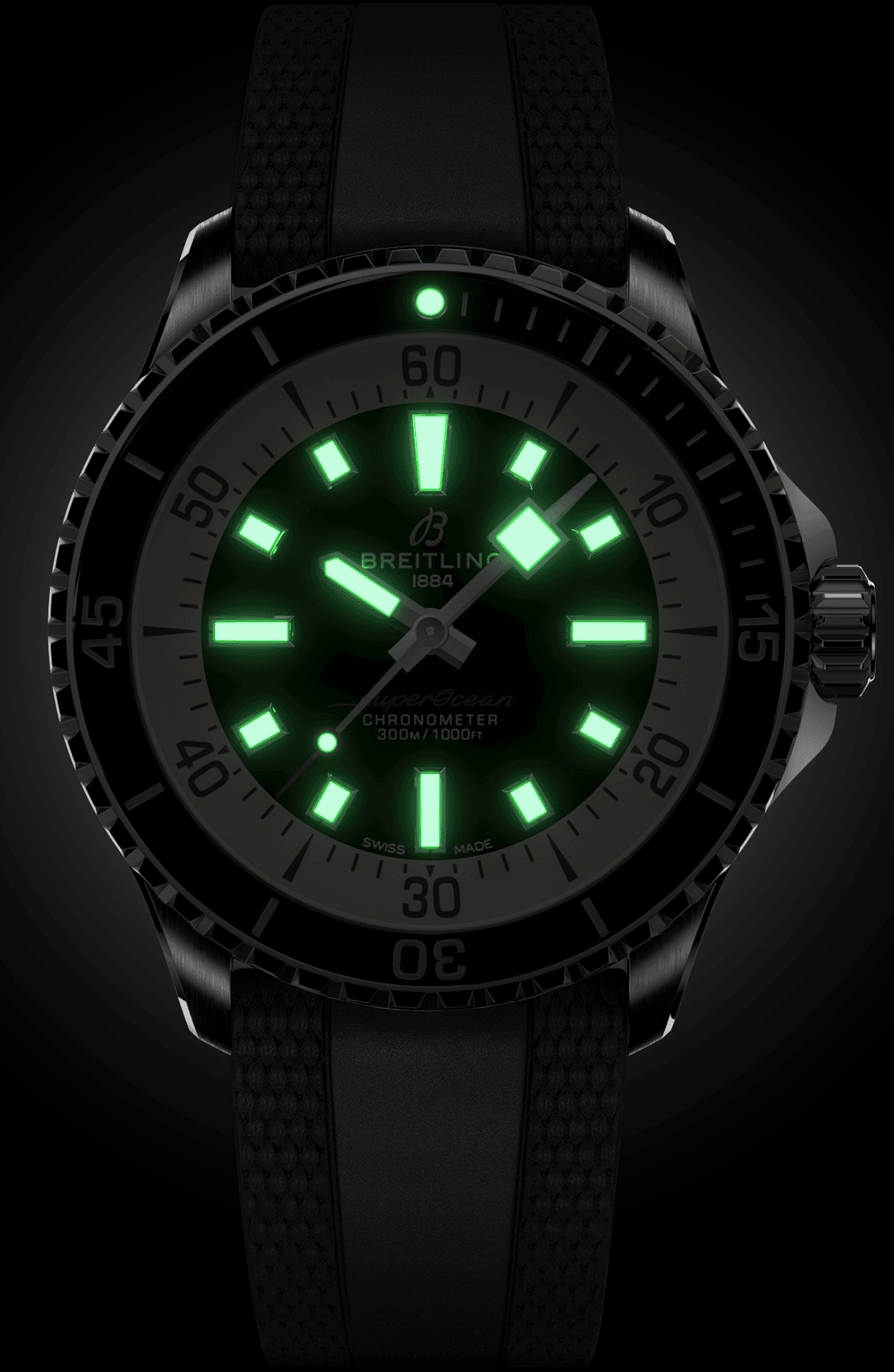 Breitling Watch Superocean III Automatic 42 A17375211B1S1. Aside from looking good, the new Superocean is also technical marvel. Broad hands and indexes coated in luminescent Super LumiNova allow for superior readability underwater. At 300 m (1000 ft) water resistance, this watch triples the minimum requirement for dive watches. The two strap options (rubber and metal bracelet) have a folding clasp that allows for micro adjustments of up to 15 mm for easy wear over rashes and dive suits. Its scratch proof ceramic inlaved bezel means it will never wear or fade. For safety, the bezel is uni directional on most sizes and bi directional with a patented lock on the 46 mm. This watch is also shock , sand and saltwater resistant. Its automatic Breitling Caliber 17 comes with a two year warranty and approximate 38 hour power reserve.