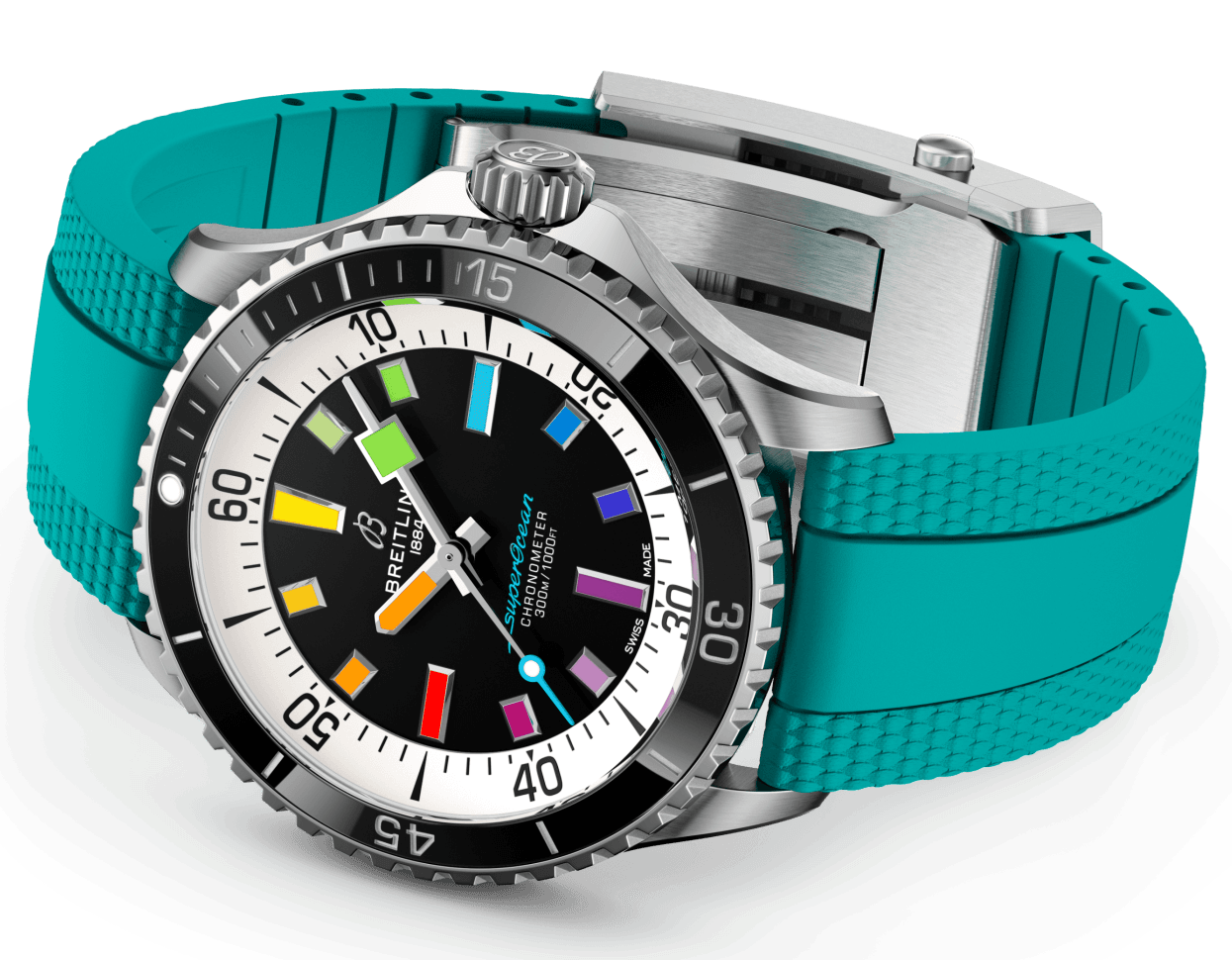 Breitling Watch Superocean III Automatic 42 Rainbow A17375211B2S2. Performance and style for all your water-based pursuits. In the 1960s, the new sport of scuba diving was all the rage. For divers, timing was everything, and Breitling set out to give them the most clear-cut dive watch possible by eliminating any feature that didn't support their lifesaving needs underwater. This pared-down watch was named the Slow Motion. What remained were clean lines, chunky luminescent indexes, squared-off hands and a high-contrast dial ring, all aimed at maximum legibility. Practical, yes. But what people really fell in love with was the look.