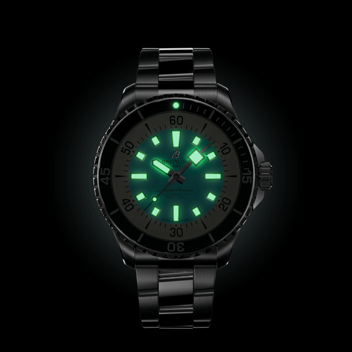 Breitling Watch Superocean III Automatic 44 A17376211L2A1. Aside from looking good, the new Superocean is also technical marvel. Broad hands and indexes coated in luminescent Super LumiNova allow for superior readability underwater. At 300 m (1000 ft) water resistance, this watch triples the minimum requirement for dive watches. The two strap options (rubber and metal bracelet) have a folding clasp that allows for micro adjustments of up to 15 mm for easy wear over rashes and dive suits. Its scratch proof ceramic inlaved bezel means it will never wear or fade. For safety, the bezel is uni directional on most sizes and bi directional with a patented lock on the 46 mm. This watch is also shock , sand and saltwater resistant. Its automatic Breitling Caliber 17 comes with a two year warranty and approximate 38 hour power reserve.