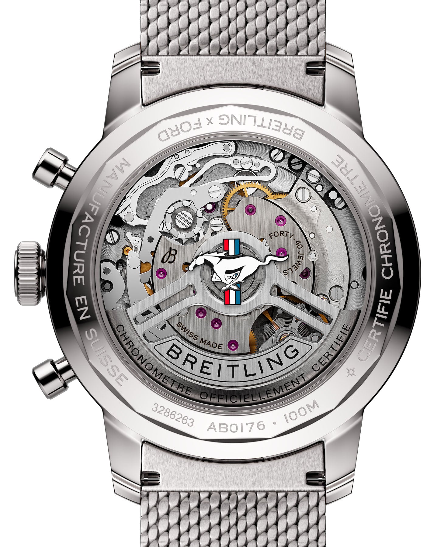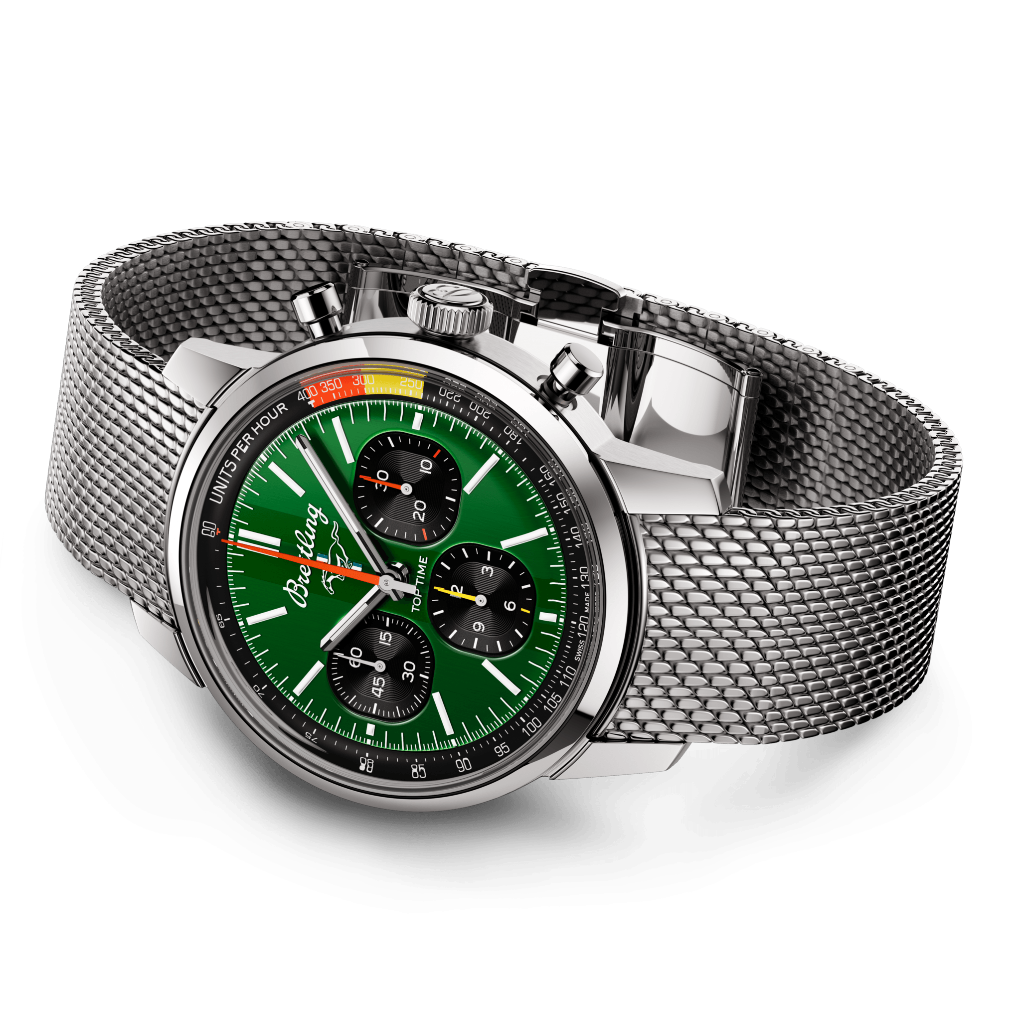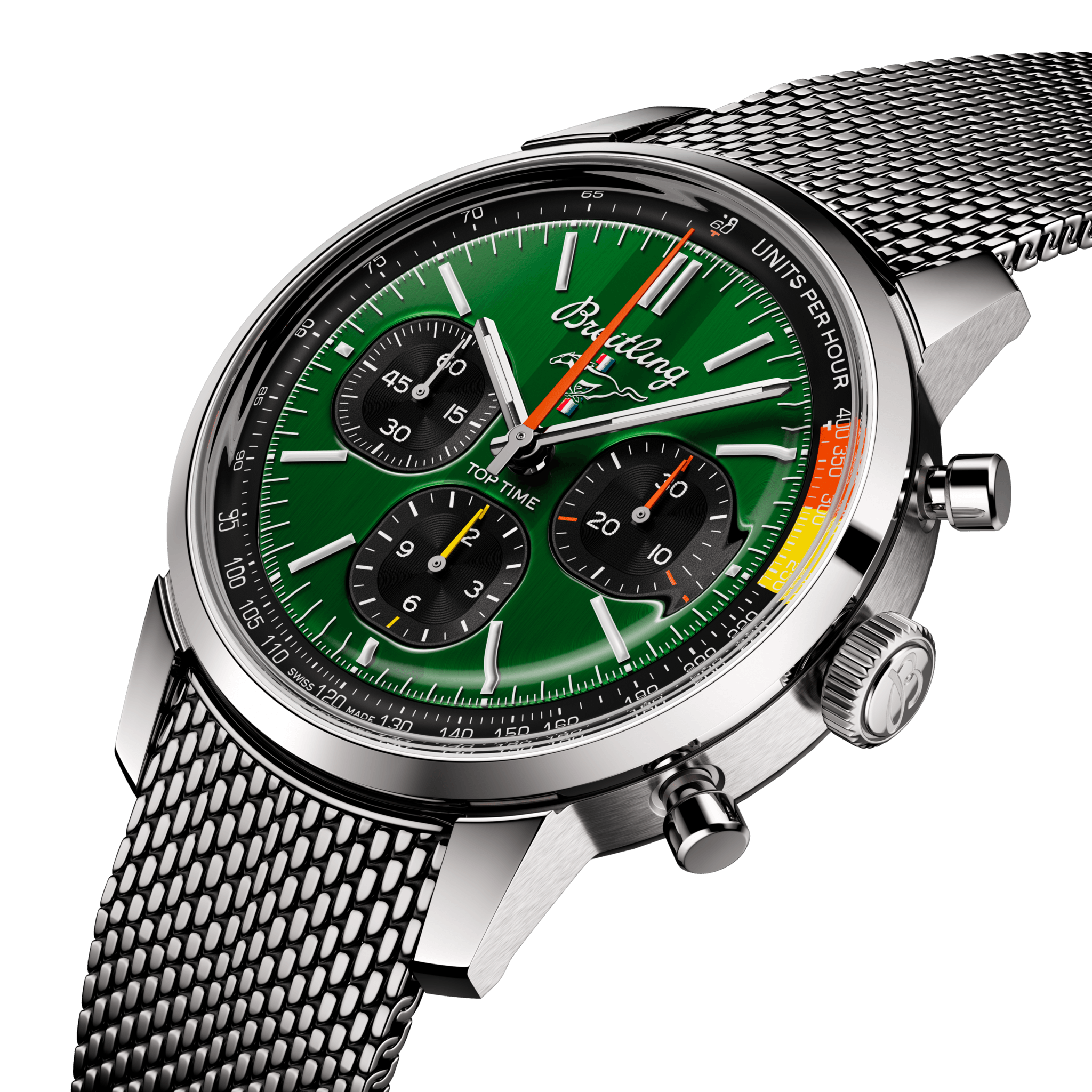 Breitling Watch Top Time B01 41 Mustang AB01762A1L1A1. The 1960s was a decade of experimentation, fun, freedom and energy. Whether cruising on a motorcycle or revving up a sportscar, living life at full speed was the order of the day. Willy Breitling felt this change of pace and set out to design an unconventional chronograph that would capture the verve of era. He called it the Top Time. That spirited tradition continues today with Breitling partnering with some of the coolest names in wheels to create its Top Time designs. The first-generation Ford Mustang, produced from 1964 to 1974, became the car of choice for hitting the road in hip 1960s America. This living legend is still in production, but car buffs know that the coolest of all were those very first models that captured the freewheeling spirit of the sixties. The Top Time B01 Ford Mustang features the colors and emblem of its classic-car counterpart as well as a perforated leather racing strap, speed-measuring tachymeter scale and contrasting “squircle (not quite square, not quite round) subdials that give the feel of vintage dashboard gauges. It also comes with a brag-worthy engine under the hood: the exceptional Breitling Manufacture Caliber 01.