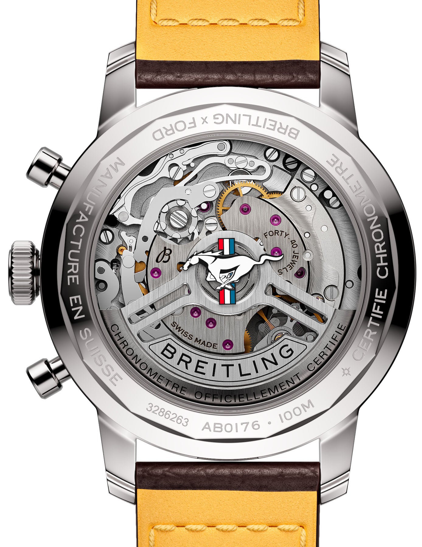 Breitling Watch Top Time B01 41 Mustang AB01762A1L1X1. The 1960s was a decade of experimentation, fun, freedom and energy. Whether cruising on a motorcycle or revving up a sportscar, living life at full speed was the order of the day. Willy Breitling felt this change of pace and set out to design an unconventional chronograph that would capture the verve of era. He called it the Top Time. That spirited tradition continues today with Breitling partnering with some of the coolest names in wheels to create its Top Time designs. The first-generation Ford Mustang, produced from 1964 to 1974, became the car of choice for hitting the road in hip 1960s America. This living legend is still in production, but car buffs know that the coolest of all were those very first models that captured the freewheeling spirit of the sixties. The Top Time B01 Ford Mustang features the colors and emblem of its classic-car counterpart as well as a perforated leather racing strap, speed-measuring tachymeter scale and contrasting “squircle (not quite square, not quite round) subdials that give the feel of vintage dashboard gauges. It also comes with a brag-worthy engine under the hood: the exceptional Breitling Manufacture Caliber 01.