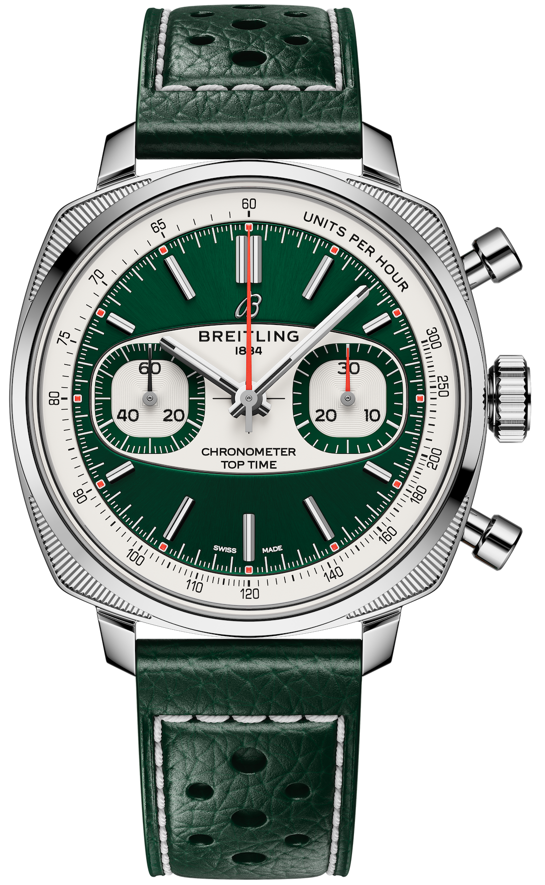 Breitling Watch Top Time B01 Racing Green Limited Edition AB01771A1L1X1. Introduced in the transformative 1960s, Willy Breitling’s unconventional line of racing-inspired chronographs captured the era’s freewheeling vibe. Today, the new Top Time collection channels that adrenaline-fueled energy, blending modern-retro design with cutting-edge performance.
