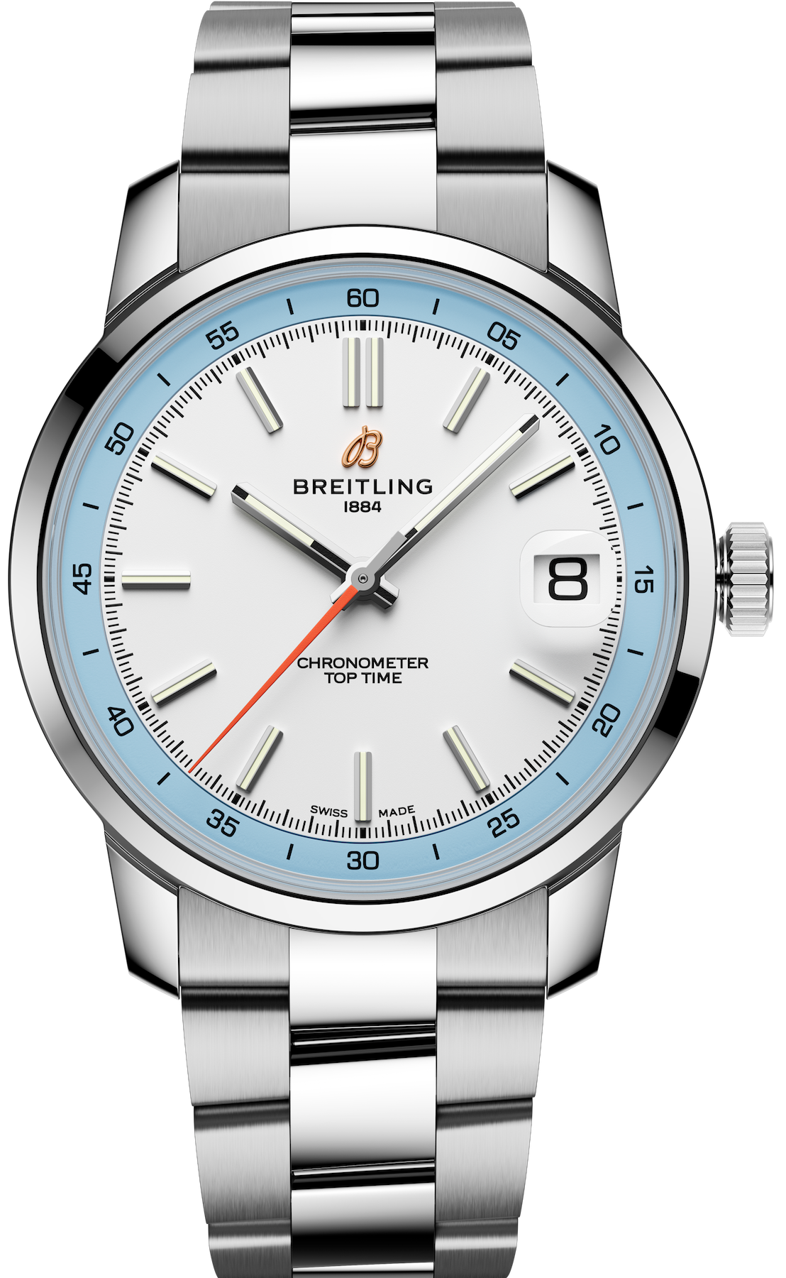 Breitling Watch Top Time B31 Light Blue Bracelet AB3113281A1A1. The Top Time B31 blends retro aesthetics with a modern edge. Its dial design takes inspiration from classic car dashboard clocks, while its 38mm case strikes a balance between vintage proportions and contemporary design, perfect for any wrist thanks to its universal size. Three colourways, green, blue, or a two tone combination of white and sky blue, pair with either a three row stainless-steel bracelet or a perforated calfskin strap that gives a nod to vintage racing gloves. Whether cruising the open road or simply embracing the everyday, this watch is a celebration of individuality and adventure.