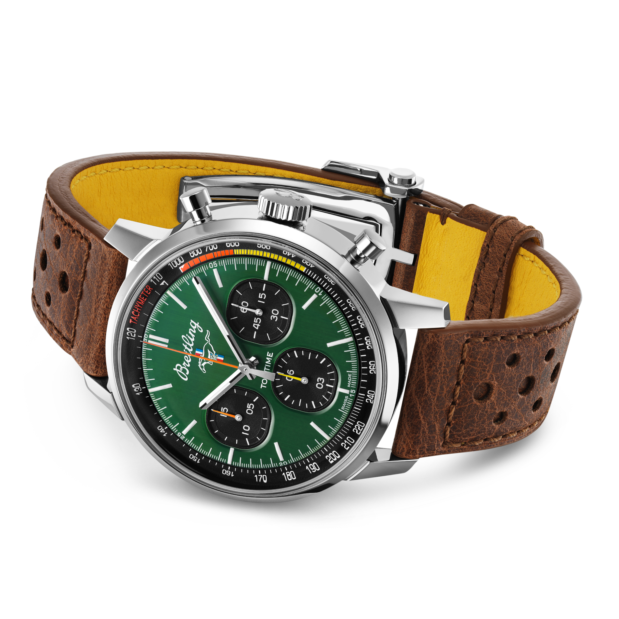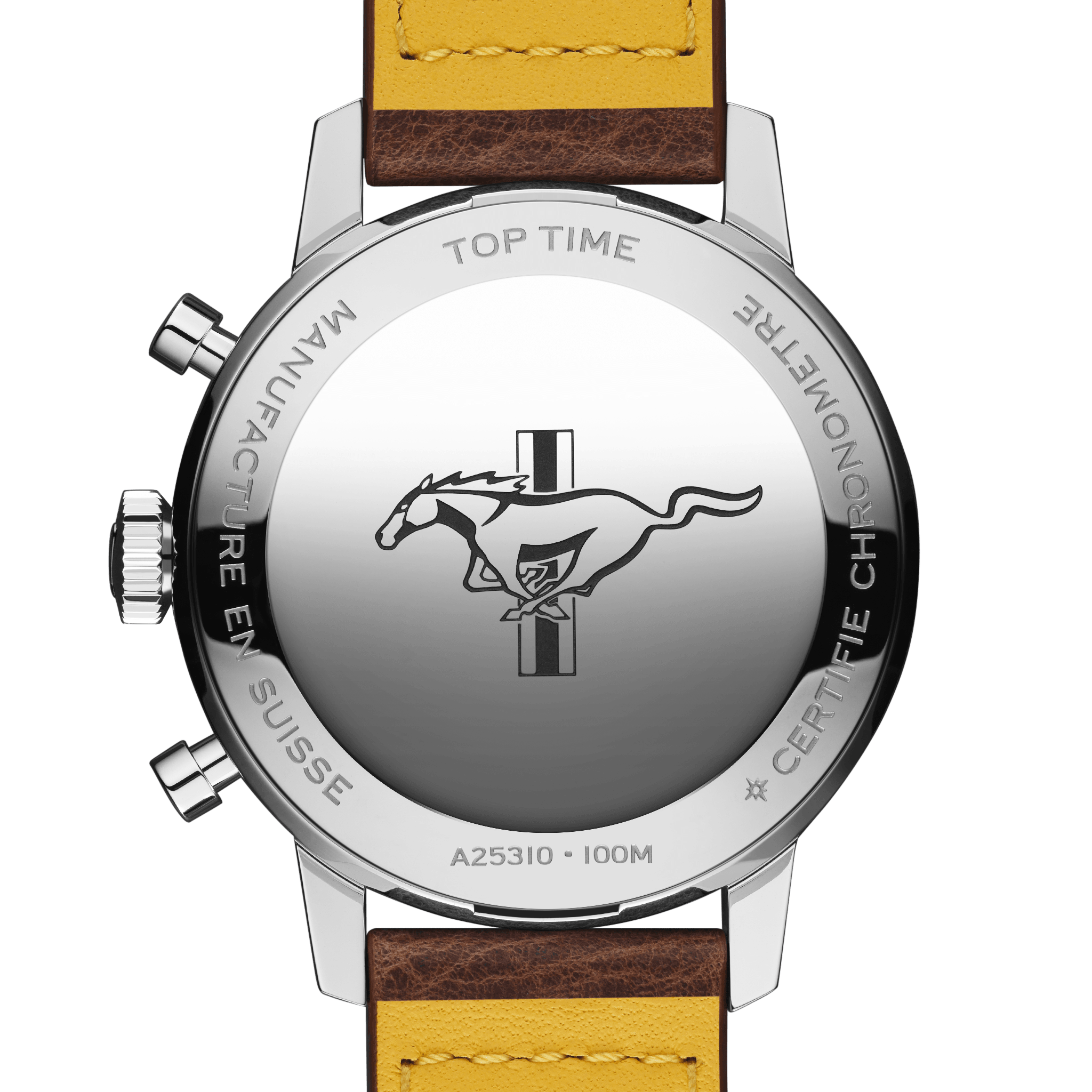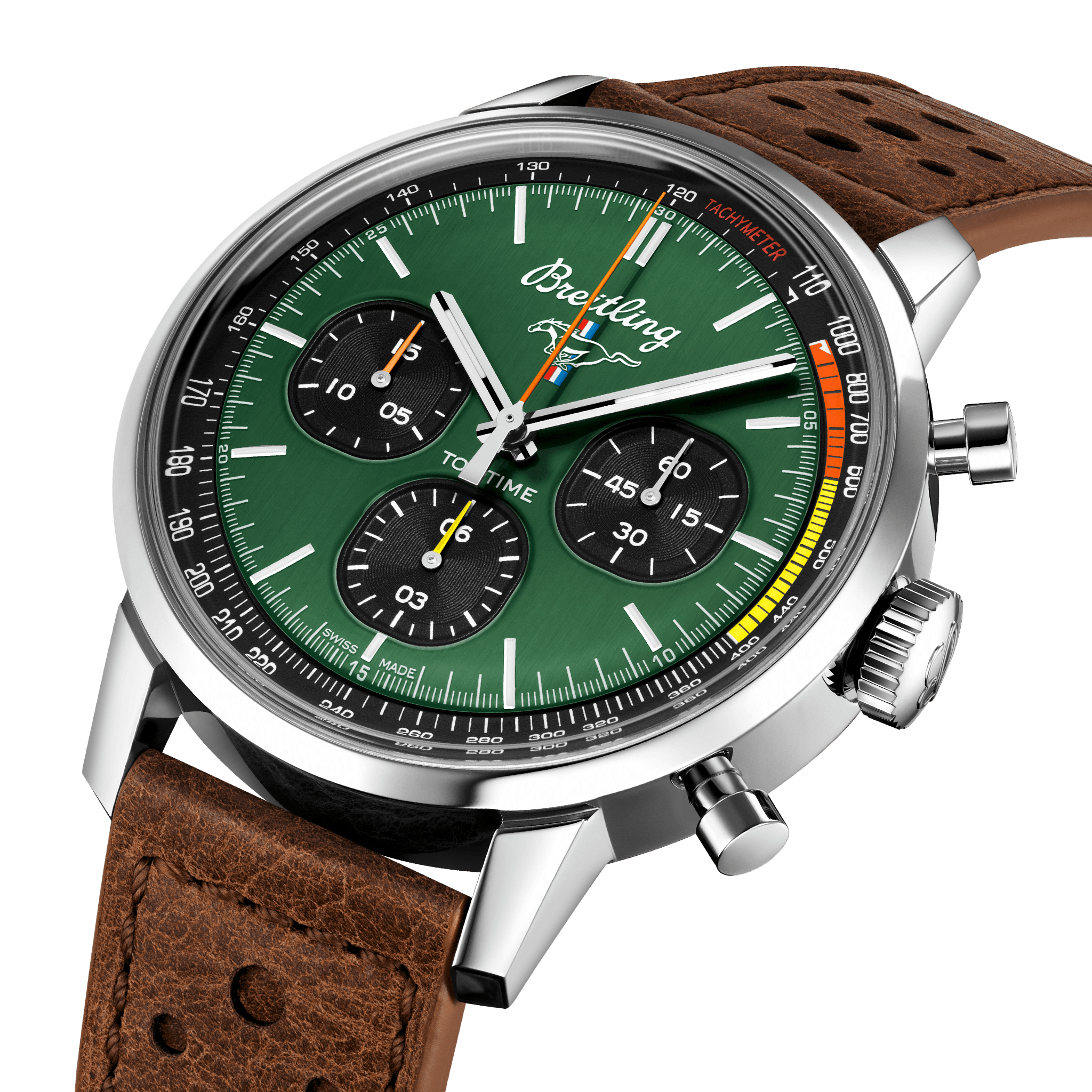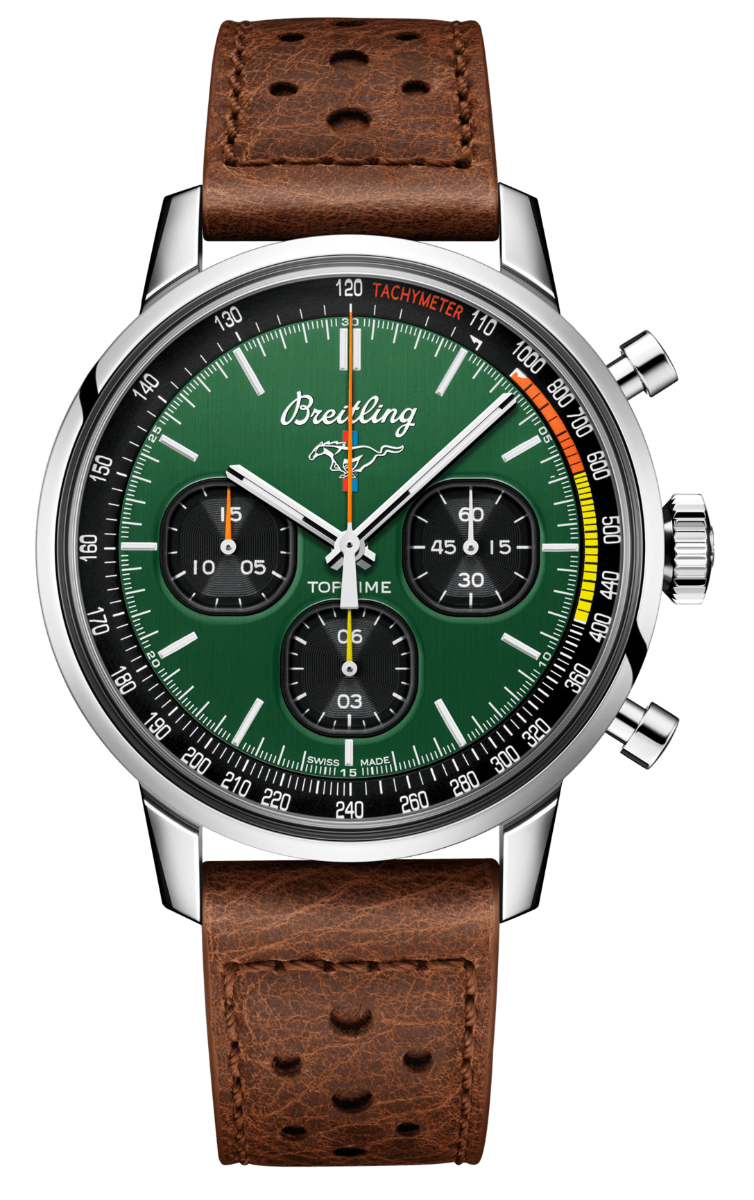 The Breitling Top Time Classic Cars watch collection revives the original Top Time reference from 1964 while tributing three classic sports cars from the same era, including the Ford Mustang. Admired for its affordable, compact and sporty offerings, the Ford Mustang was a rock star of the 1960’s. Based on one of these very vehicles, the Breitling Top Time Ford Mustang watch opts for a bold green dial, three contrasting black chronograph counters, a matching black tachymeter scale and a sporty brown perforated calfskin leather strap. As a nod to the car’s speed, there’s also contrasting orange and yellow details on the tachymeter scale and a handsome engraving of the Ford Mustang logo both on the dial and the case back.