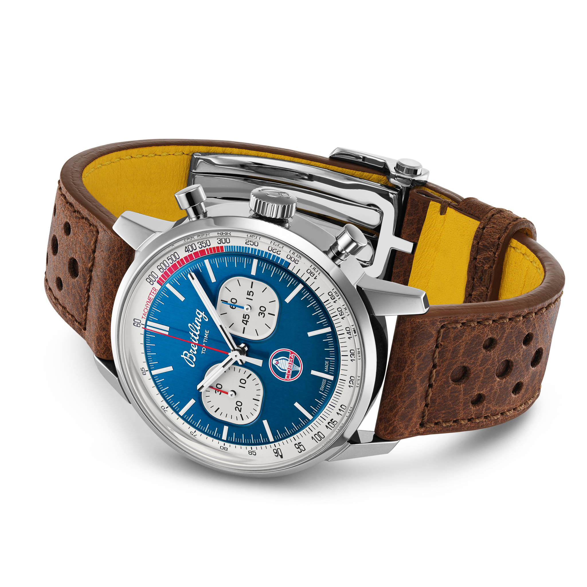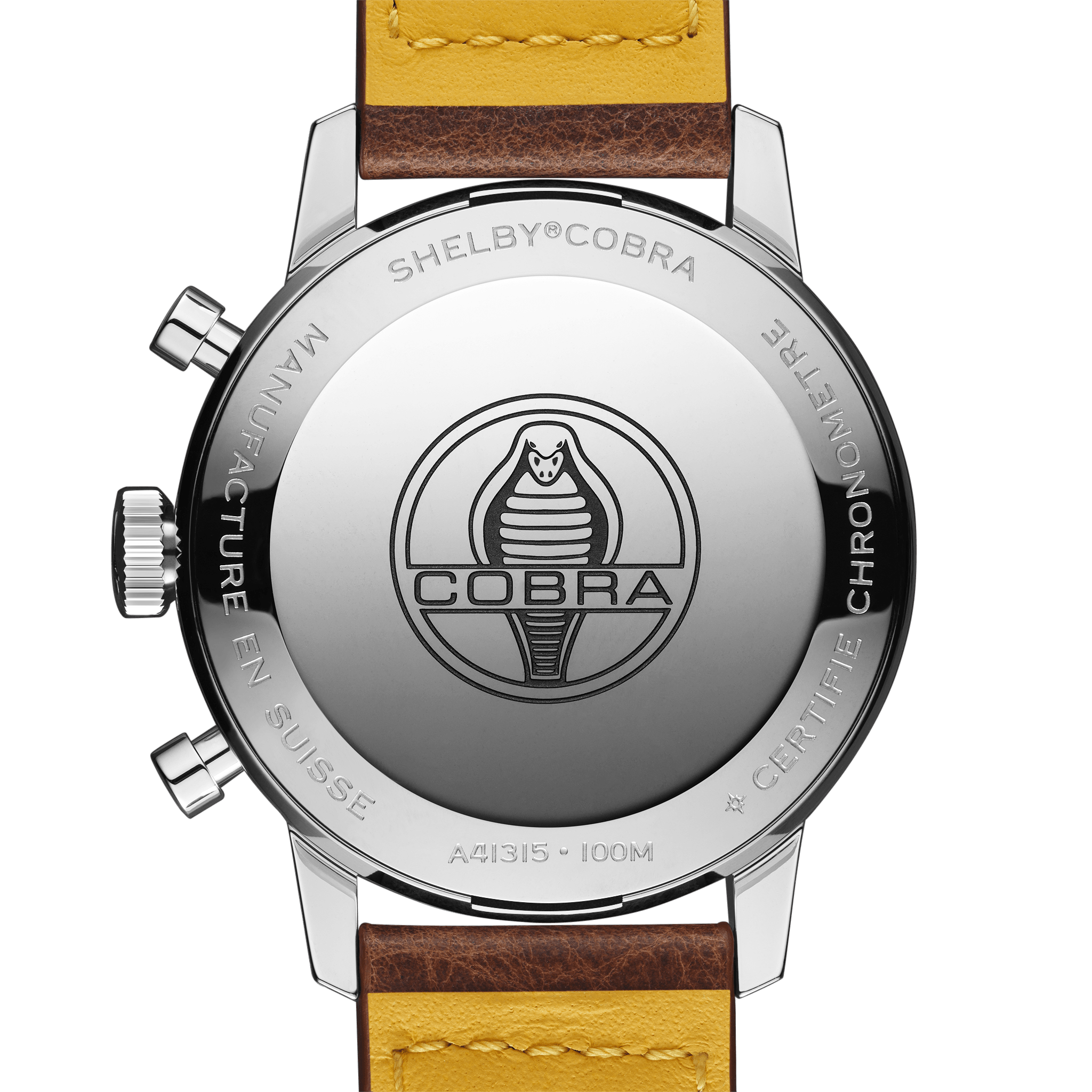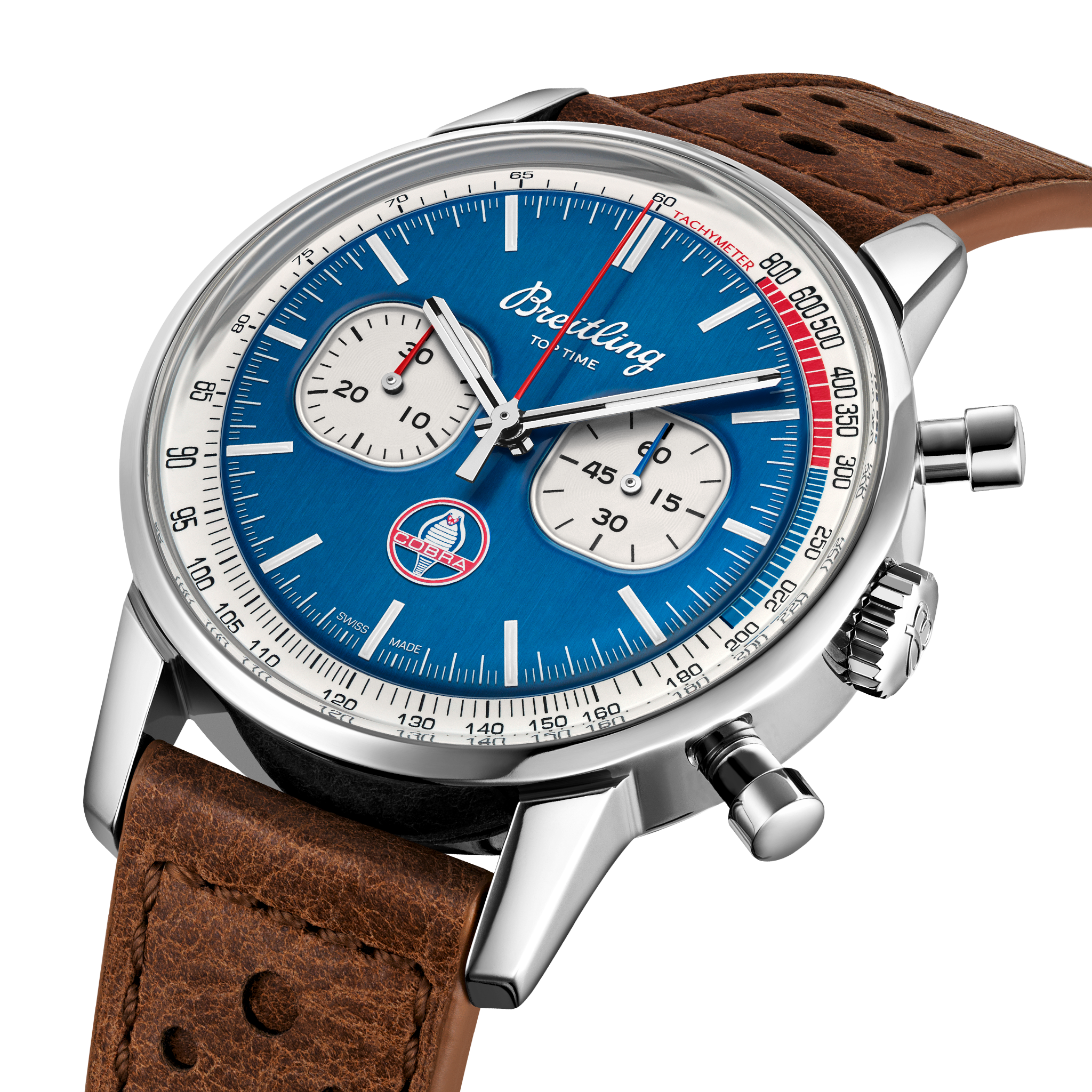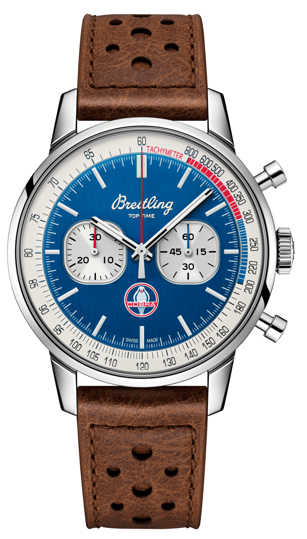 Breitling's unconventional chronograph with a motoring twist. A distinctive celebration of design and freedom, the Breitling Top Time Classic Cars Squad pays homage to classic sports cars from the 1960s with a trio of racing chronographs. Drawing inspiration from the Chevrolet Corvette, Ford Mustang and Shelby Cobra, the timepieces themselves are a nod to the original 1960s Breitling Top Time models, which were designed for “young and active professionals. Today’s modern-retro interpretations are perhaps even more youthful and free-spirited. In the early 1960s, the Le Mans winner Carrol Shelby imagined a car that combined British chassis design with American racing engineering. He created the Shelby Cobra, a sportscar that ingeniously matched a small, light chassis to a strong, reliable American big block engine. When it was introduced in 1962, the Cobra met with instant success. The original Shelby Cobra remains a blisteringly fast and thought-after car until today. Featuring a 40-millimetre stainless-steel case matched to a brown racing-themed calfskin leather strap, the Top Time Shelby Cobra features red and light-blue details on its blue dial and the Shelby Cobra logo both on the dial and the caseback. The Top Time Shelby Cobra is powered by the Breitling Caliber 41, a COSC-certified chronometer.