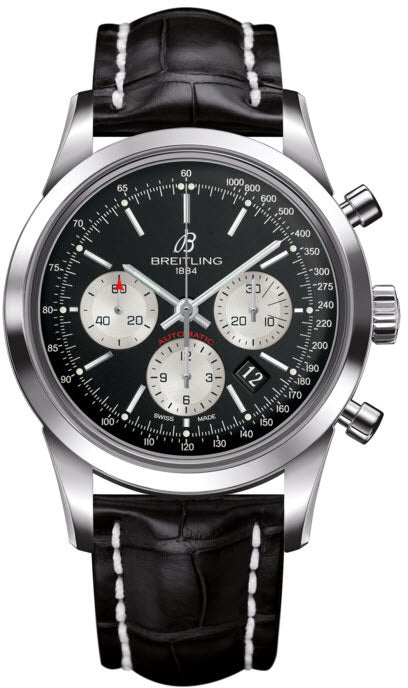 Coming in strong as one of our favourite Breitling dress watches, this Transocean Chronograph boasts a sleek 43mm stainless steel case and curved lugs that moulds effortlessly to the wrist while the highly sophisticated strap is crafted from luxurious black crocodile leather. Designed to fulfil every occasion, this Breitling Transocean Chronograph not only looks the part but is fully equipped to time your adventures. The smooth black dial is beautifully detailed with sleek steel hour and minute hands, subsidiary seconds dial, central chronograph seconds, a date window at 4 o clock and two chronograph counters for 30 minutes and 12 hours. As well as boasting a power reserve of 70 hours, this Breitling men chronograph comes equipped with a 100 metre water resistant case, non screw locked crown and highly reliable convex sapphire crystal glass treated with antireflective coating on both sides.