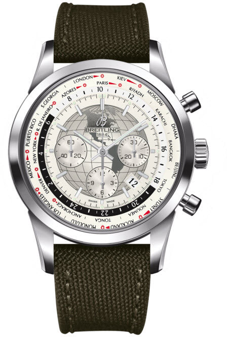 Breitling Watch Transocean Chronograph Unitime Polar White AB0510U0/A790/105W. With the Manufacture Caliber B05, the Breitling engineers have reinvented the worldtime mechanism by endowing it with unprecedented user friendliness. When the user changes timezone, simply turning the crown forwards or backwards enables instant correction of the hour hand, the city disk and the 24 hour disk, while automatically adjusting the date to local time. Available in steel or red gold, this extremely stylish model is also a high performance selfwinding chronograph.