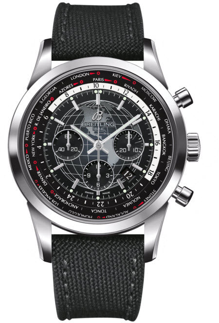 Breitling Watch Transocean Chronograph Unitime Steel Black AB0510U4/BE84/100W. With the Manufacture Caliber B05, the Breitling engineers have reinvented the worldtime mechanism by endowing it with unprecedented user friendliness. When the user changes timezone, simply turning the crown forwards or backwards enables instant correction of the hour hand, the city disk and the 24 hour disk, while automatically adjusting the date to local time. Available in steel or red gold, this extremely stylish model is also a high performance selfwinding chronograph.