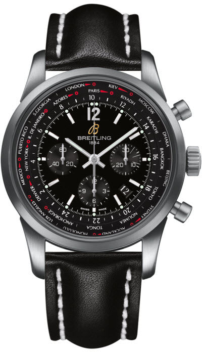 Breitling Watch Transocean Unitime Black AB0510U6/BC26/441X. Featuring a satin brushed steel case, this worldtime chronograph combines a Manufacture Breitling Caliber B05 with a black and white technical look echoing Breitlings grand tradition of watches for aviators. The dial enables simultaneous readings of the time in all 24 timezones, complete with an ultra practical crown operated setting system as well as automatic adjustment of the date to local time in both directions.