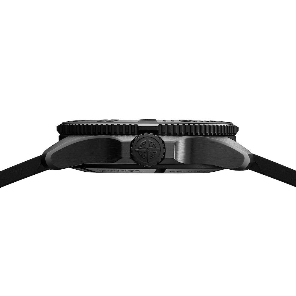 Durable black rubber chevron strap with pin buckle clasp and quick-release system, offering effortless strap changes.