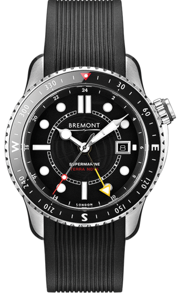 Bremont Watch Supermarine GMT Titanium Terra Nova Limited Edition TN. To mark the extraordinary boundaries pushed by Ben Saunders and his team mate Tarka L Herpiniere during their inspiring polar exploration from Scotts Hut on the north shore of Ross Island in the Antarctic to the South Pole, Bremont watch company have released the watch which accompanied both explorers wrists throughout the whole journey. The Bremont Supermarine from the iconic Terra Nova collection features a beautiful GMT function with a striking yellow arrow tip for ultimate legibility. The story behind the sleek Bremont timepiece mirrors the explorers desire to tests themselves beyond limits imaginable to reach goals and challenges that only the most dedicated and strong minded can reach. The Bremont Supermarine Terra Nova dressed in a satin and polished titanium case with a bi directional rotating bezel, treated with a self glowing Super LumiNova paint, encapsulates levels of pure innovation and expert pioneering artwork worthy of any pedigree Bremont masterpiece. The 43mm diameter structure also consists of a patented anti shock movement mount for protection against extreme external conditions, a crown protector and automatic helium escape valve for underwater pressures and an inner soft anti magnetic Farady cage. The metal dial itself is black coated with a wave like pattern to the central circle of the face and matching black coated minute, hour and sweeping seconds hand, the latter which has been decorated with a stunning emergency red hue to the tip. A date window with stainless steel rim is situated at the 3 o clock location whilst the beautifully elegant contours of the surrounding bezel is secured with an anti reflective and scratch resistant sapphire crystal glass front. The breathtaking Bremont Supermarine GMT Titanium Terra Nova watch houses the modified calibre 13 1 4 BE 93 2AE which includes 25 jewels, an anachron balance spring, a moulded skeletonised decorated rotor, glucydur balance and a 42 hour power reserve. The exquisite Bremont watch, limited to just 300 pieces is finished on an integrated black rubber strap with pin buckle.