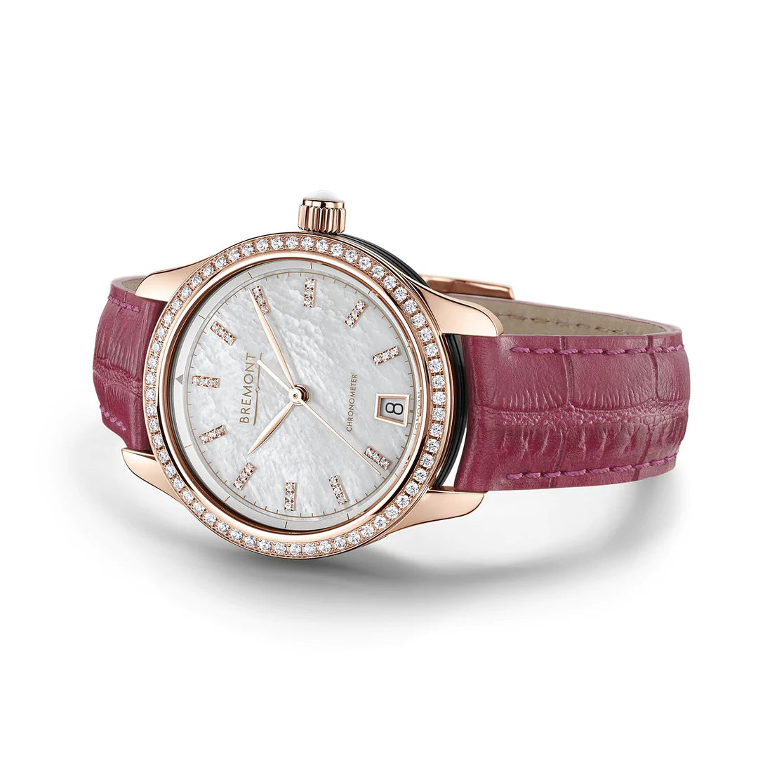 Bremont Watch Lady K Rose Gold LADY-K-RG-R-S. Named after the boat that Co-Founders Nick and Giles’ father lovingly hand-built for their mother, the Lady K builds upon the brand’s established aviation and military principles with elegance and finesse, striking a neat balance between being jewellery and timepiece. Bremont is delighted to introduce four new colour ways into the collection which is clearly identifiable by its stunning bezel and sunburst finished dial, both incorporating white brilliant cut diamonds.
