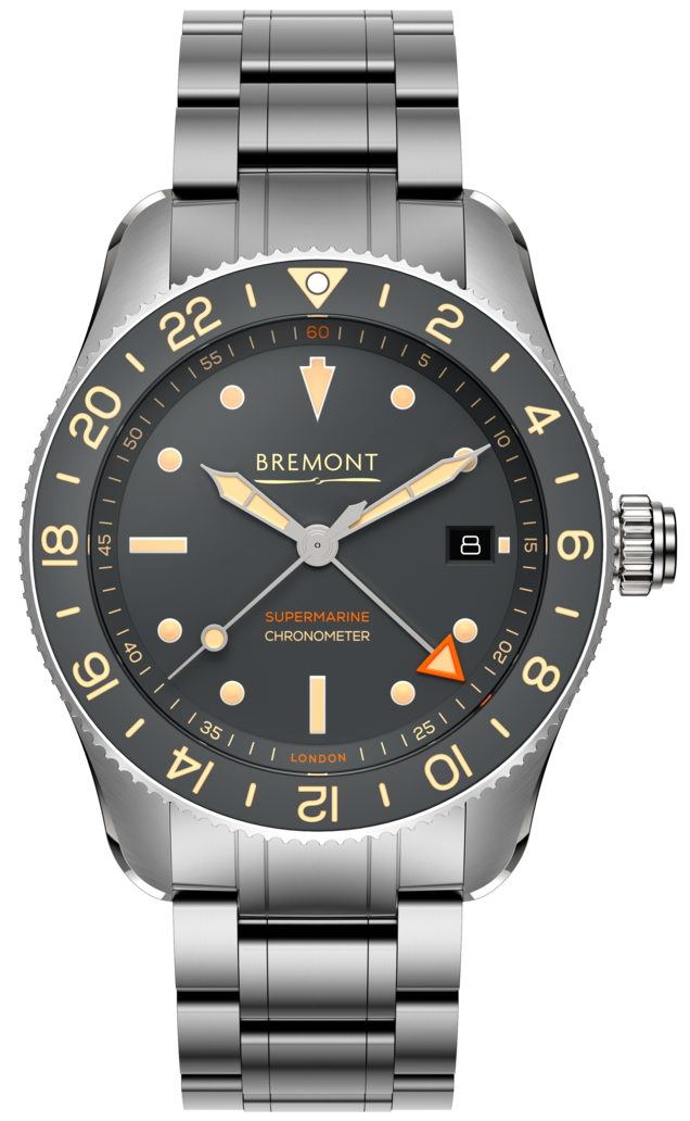 Bremont Watch Supermarine S302 GMT Bracelet Limited Edition S302-GR-B. At home above and below the waves, the Supermarine Collection epitomises the Bremont DNA with its robust, uniquely identifyable Trip-Tick case construction and critical functions required for professional diving and other adventurous pursuits.