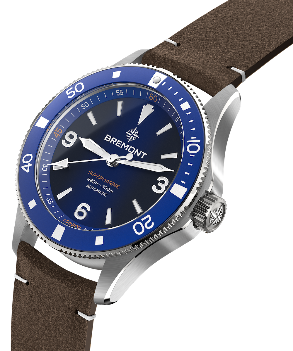 Bremont Watch Supermarine 300M Blue Leather SM40-ND-SS-BL-L-S. Over the years, Bremont has developed its Supermarine diving watch collection to the exacting specifications required for professional divers and military personnel, working with the likes of the Royal Navy Clearance Divers, Special Forces Units, North Sea Deep Sea Divers and the Royal Marines. Bremont has also worked closely with open water swimmers, free divers, scuba divers and professional sailing teams to ensure our watches can be relied upon in any marine environment. We are proud to have created a collection of watches which is relied on by the best.