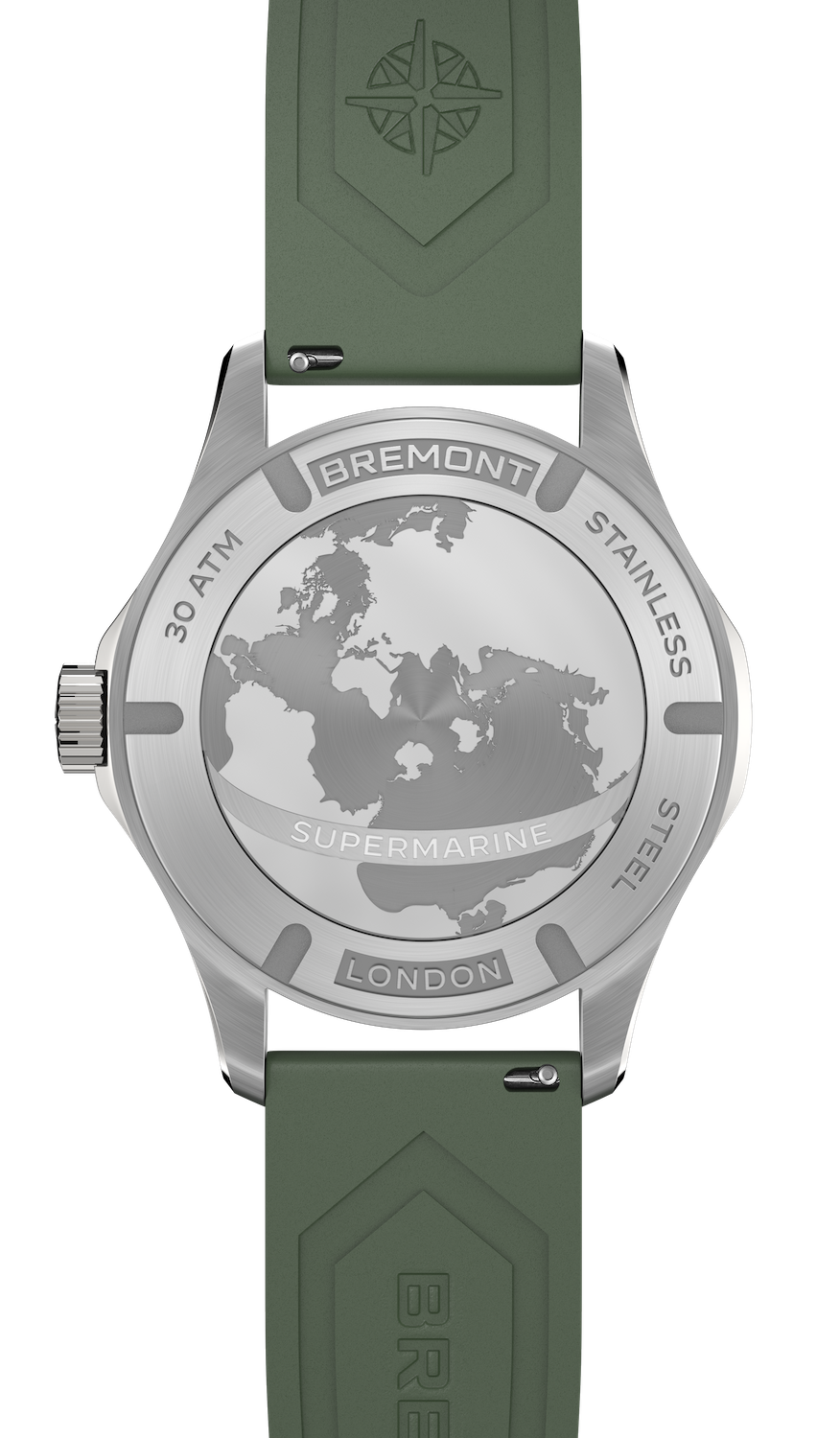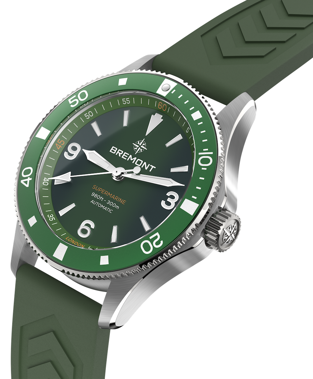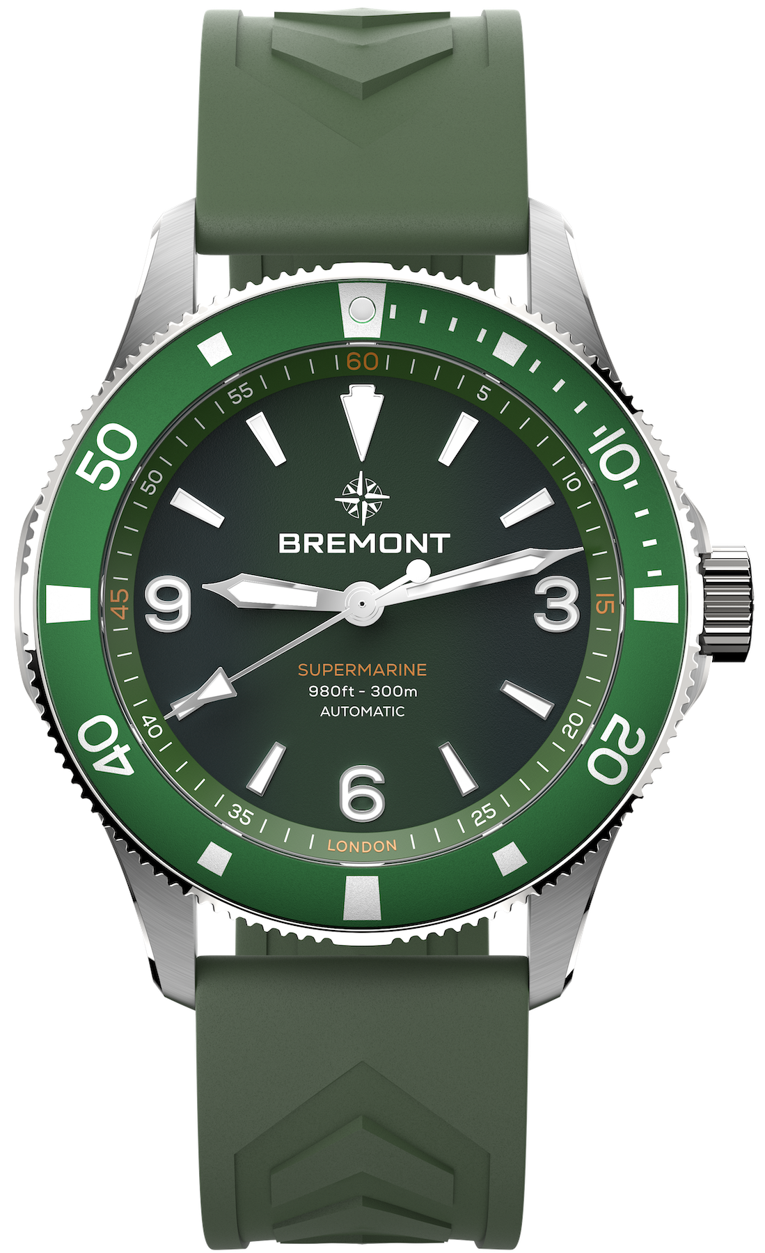 Bremont Watch Supermarine 300M Green Rubber SM40-ND-SS-GN-R-S. Over the years, Bremont has developed its Supermarine diving watch collection to the exacting specifications required for professional divers and military personnel, working with the likes of the Royal Navy Clearance Divers, Special Forces Units, North Sea Deep Sea Divers and the Royal Marines. Bremont has also worked closely with open water swimmers, free divers, scuba divers and professional sailing teams to ensure our watches can be relied upon in any marine environment. We are proud to have created a collection of watches which is relied on by the best.