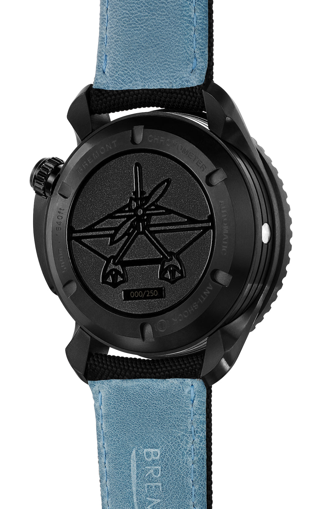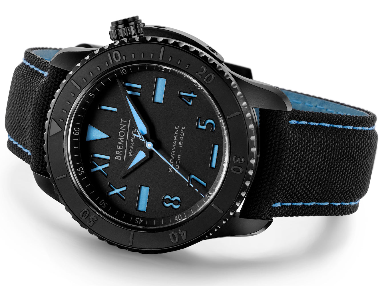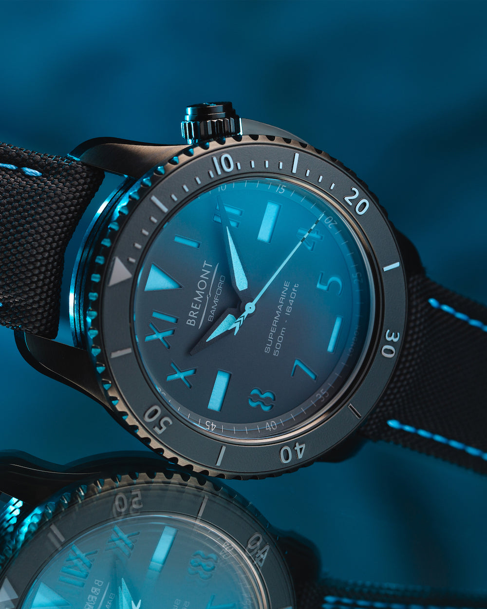 The resulting Special Edition, limited to just 250 pieces, represents a distinct twist on Bremont’s signature Supermarine S500, combining Bamford’s passion for vibrant lume and DLC finish with Bremont’s tactical and notoriously robust diving range. The DLC finish is beautifully contrasted with the ‘California Blue’ Super-LumiNova across the newly styled hands and indexes, befitting for its California dial, a design first for both Bremont and Bamford. The highly legible dial is enhanced by increased luminosity as a result of its ‘layered dial’ construction. Instead of a single plate, a layered dial is comprised of a solid disc of luminous material which is covered with a plate with index apertures to expose the lume as characters. This layered design achieves incredible lume performance and adds a lovely visual depth to the dial. The extensive use of black DLC, uniquely accented with blue, marks this timepiece as an unmistakable Bamford collaboration.
