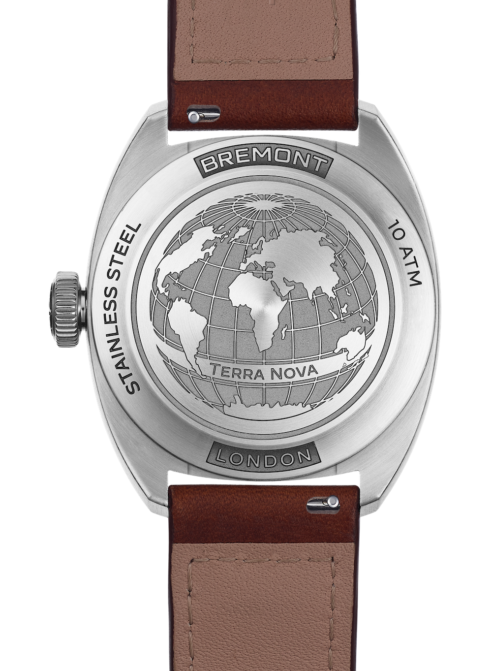 Bremont Watch Terra Nova 38 Black Leather TN38-ND-SS-BK-L-S. Constructed from 904L satin and polished stainless steel, the Terra Nova is built to withstand the rigours of everyday adventures. Each timepiece is powered by an automatic movement, ensuring accurate timekeeping wherever your journey takes you. An anti-reflective sapphire crystal protects the dial while maintaining clarity, and full block Super-LumiNova® numerals provide exceptional visibility in low-light conditions. Choose from a quick-release stainless steel bracelet, NATO or leather strap for versatile wear.