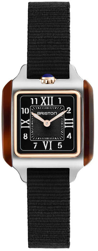 Briston Streamliner Kennedy Petite Black Watch 252025.PRA.T.1.NB. The Streamliner Kennedy collection perfectly blends modernity and heritage. The watch features a refined square case with acetate sides, symmetrical lines and a crown at twelve o'clock (except for the chronograph model) adorned with a lapis lazuli cabochon. Its name evokes the timeless elegance and casual, tribute to the preppy style of the famous American family.