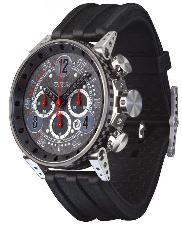 B.R.M. Watches V18-48-TN Black Hands. BRM is the only French watchmaking manufacture, born of the strength of commitment and competitive spirit that has always fuelled Bernard Richards. Armed with over 25 years watchmaking experience, BRM watches manufactures 2,000 watches every year. Reflecting exceptional mechanical sophistication and acclaimed by the aficionados of mechanical sports. This Racing Spirit is anchored in the BRM mind: machining, chequered motorsport flags on cases and straps, high tech materials exploited in racing car construction used as watch components.