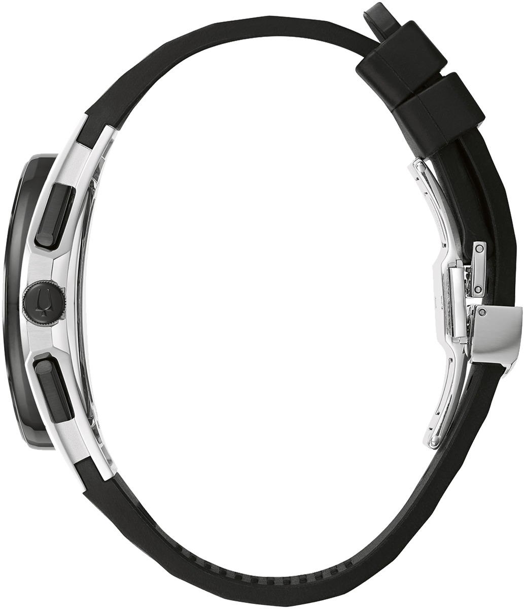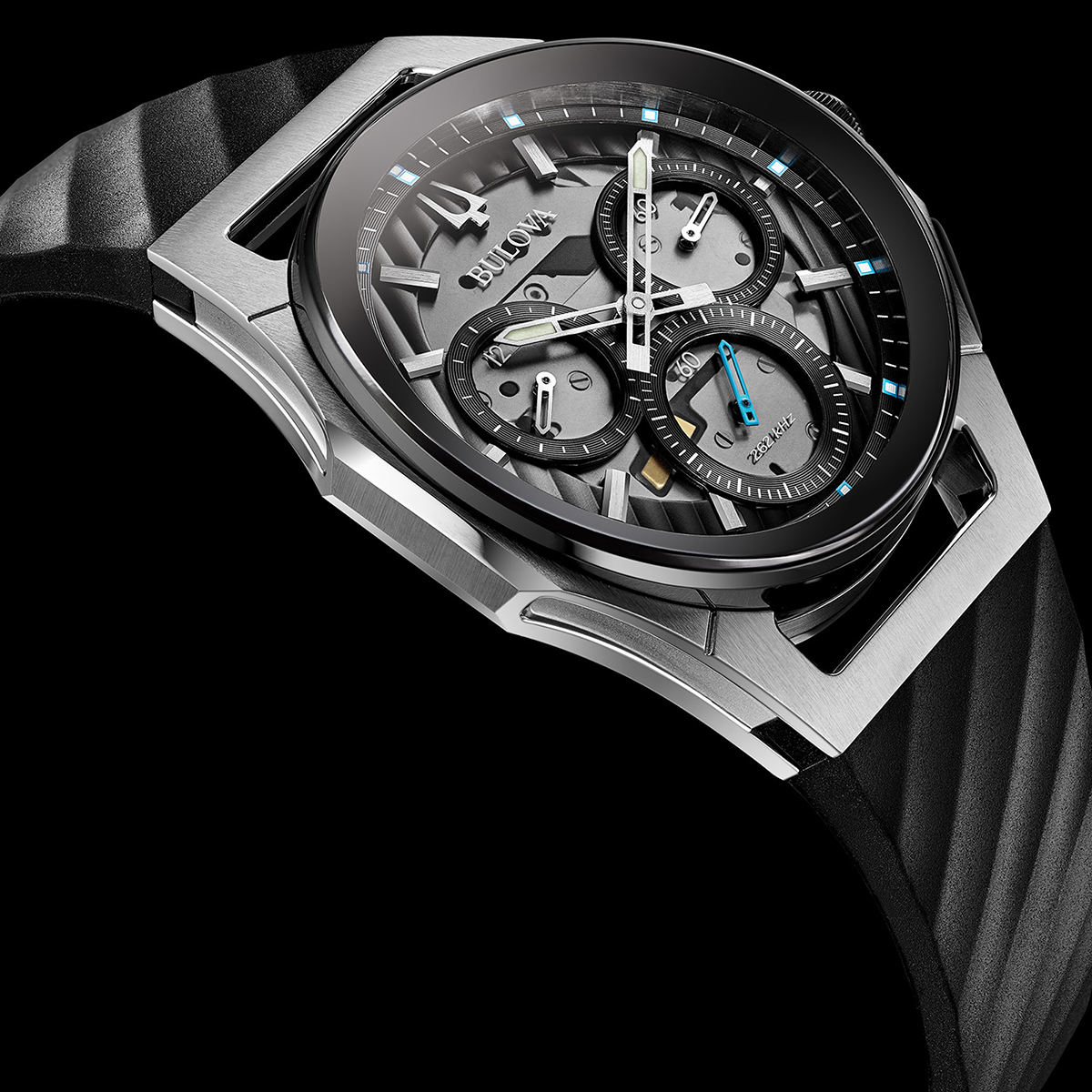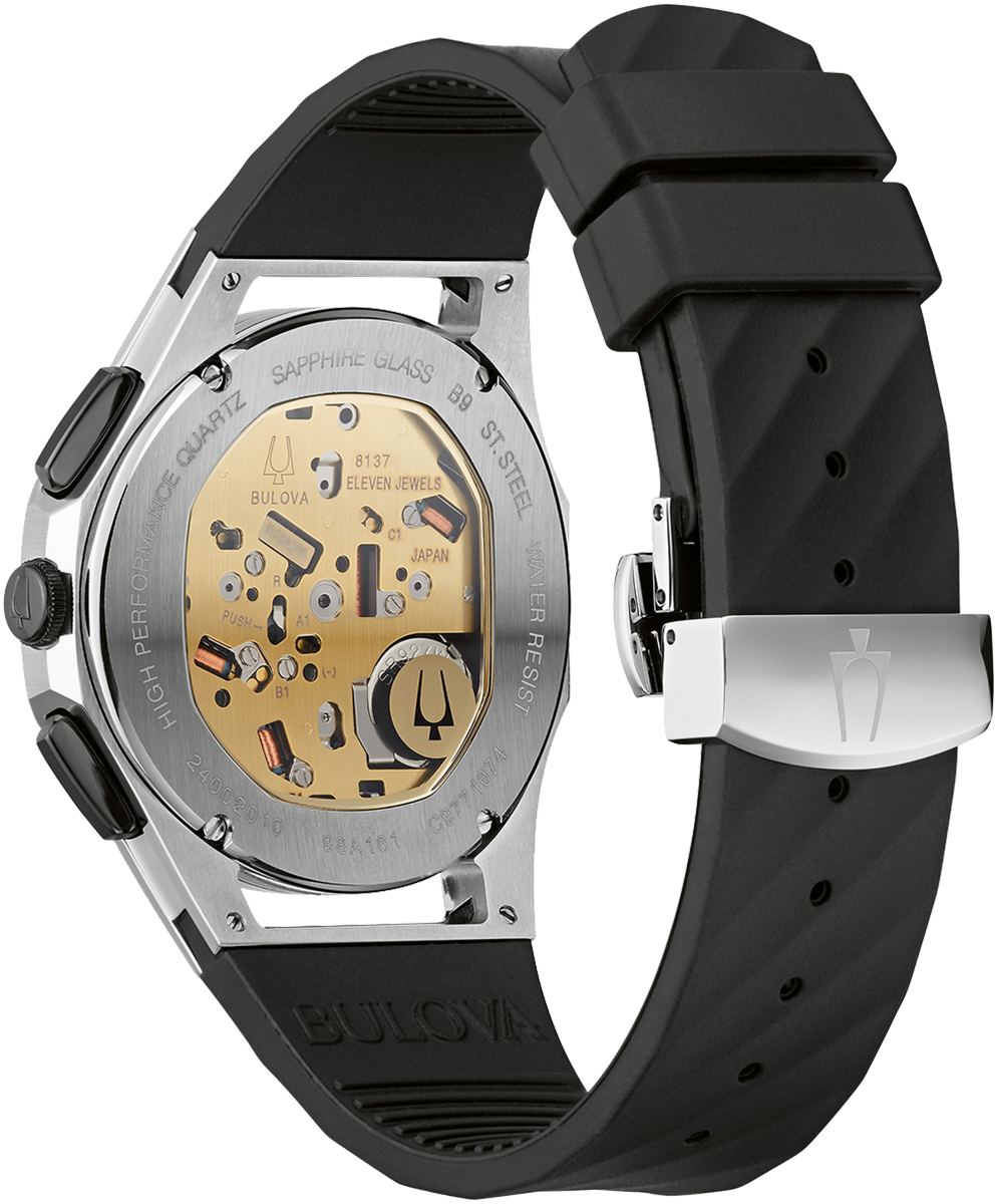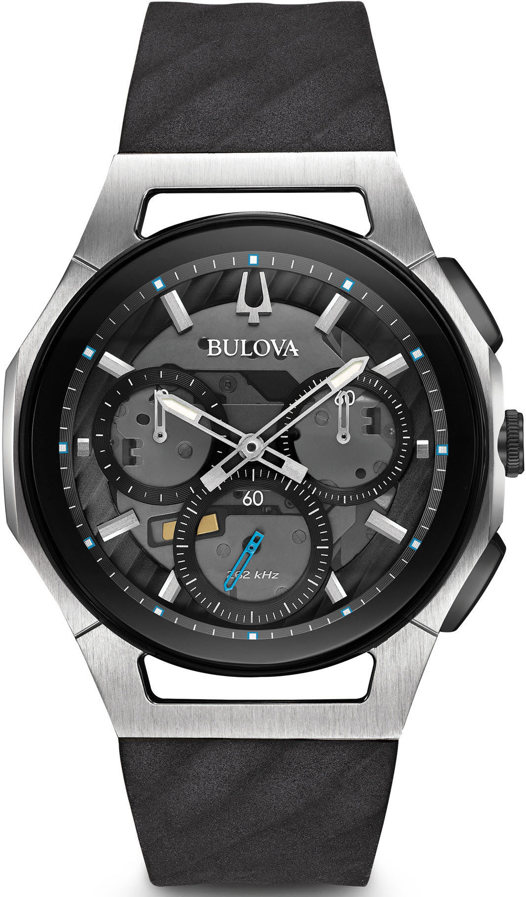 Bulova Watch Curv 98A161. The worlds first curved chronograph movement features high performance quartz technology with 262 kHz vibrational frequency for precise accuracy. Five hand chronograph in stainless steel case with black bezel, dark grey exhibition dial with blue accents, exhibition caseback, curved sapphire glass, black rubber 3 piece buckle closure, and water resistance to 30 meters.
