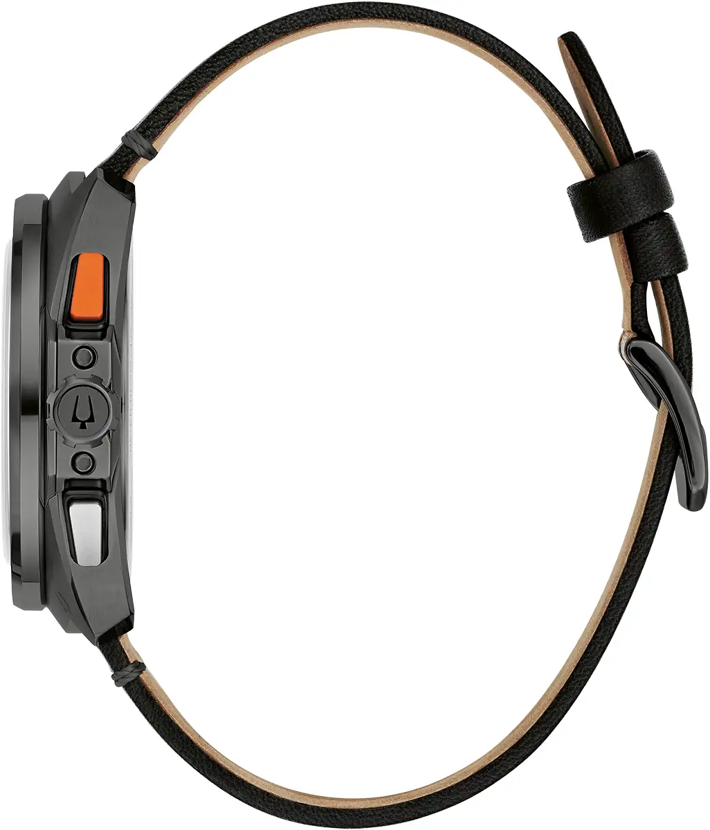 Bulova Watch Racer Chronograph 98B428. Built on Bulova’s vibrant history in motorsport – from Soap Box Derby to the upper echelons of auto racing – the new men’s Racer chronograph watch is fine-tuned and designed for performance. The contoured black IP stainless steel case features a unique design evoking the aerodynamic curves of the world’s fastest automobiles. A two-tone orange and black tachymeter ring offers further functionality, while pronounced pushers provide a distinctively automotive aesthetic. The black 5-hand chronograph dial features an orange and white racing pattern chapter ring, with a date display at 6 o’clock and black subdials displaying the chronograph minutes and the 24-hour time. A bold orange chronograph seconds hand ensures optimal legibility no matter the speed. The dial is appointed with applied silver-tone markers and matching bevelled hands, all filled with a super-luminous material for low-light visibility. The watch is paired with a perforated black leather racing-style strap with a pin buckle closure. Whether gripping the wheel around the bend at the track or on your daily commute, the Bulova men’s Racer chronograph is a stylish expression of racing history and a passion for speed.