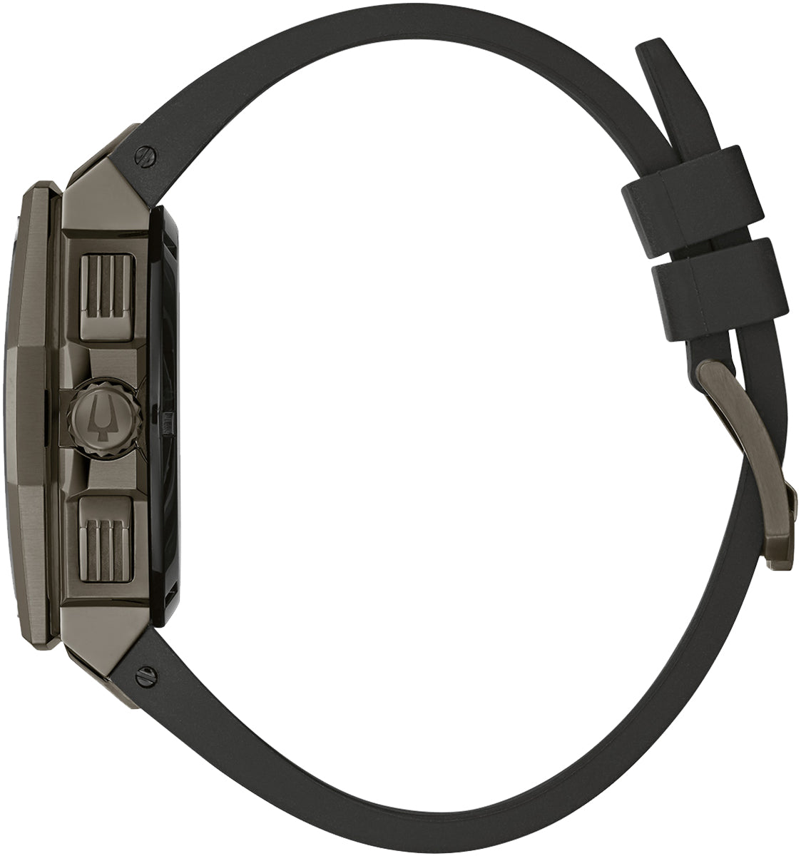 Bulova Watch Precisionist X Chronograph 98B358. Marking the 10th anniversary of the Precisionist, the Precisionist X is a celebration of unparalleled accuracy. The Precisionist X features a distinctive grey stainless steel case with a black top ring insert, a black dial with red applied markers and hands, a calendar window, and a view into the proprietary Precisionist eight hand chronograph high performance quartz movement. The black textured rubber strap is complete with a three piece buckle closure. The case features a curved sapphire crystal with anti reflective coating, screw down case back and crown, and water resistant to 300 metres.