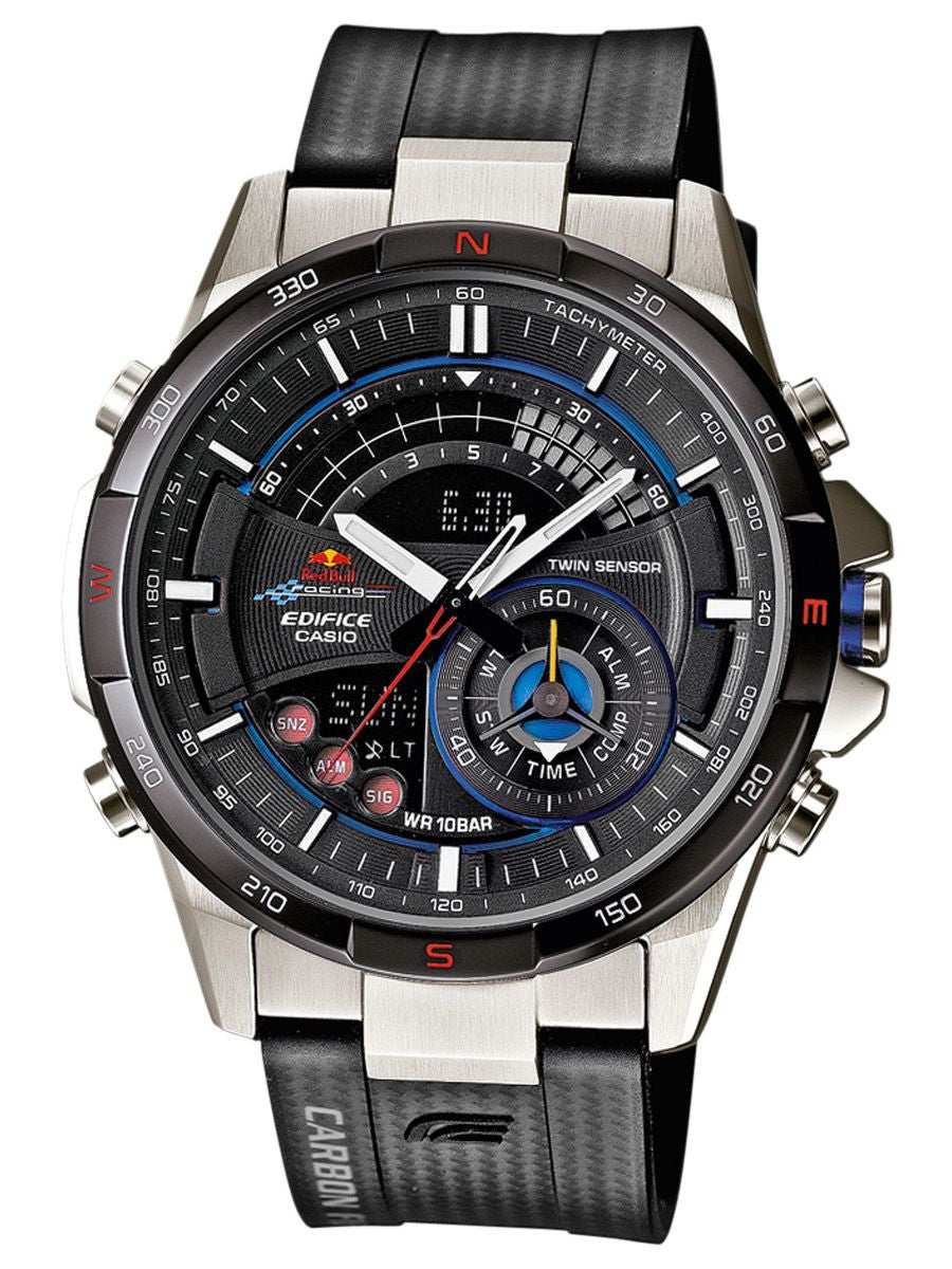 CASIO Edifice Redbull Limited Edition Black Rubber Chronograph, A built-in direction sensor detects magnetic north and indicates current direction in degrees. A luminous coating provides long-term illumination in the dark after only a short exposure to light. The daily alarm reminds you about recurring events with an acoustic signal at the time you have set. You can also activate hourly time signals each hour. This model has 5 independent alarms.