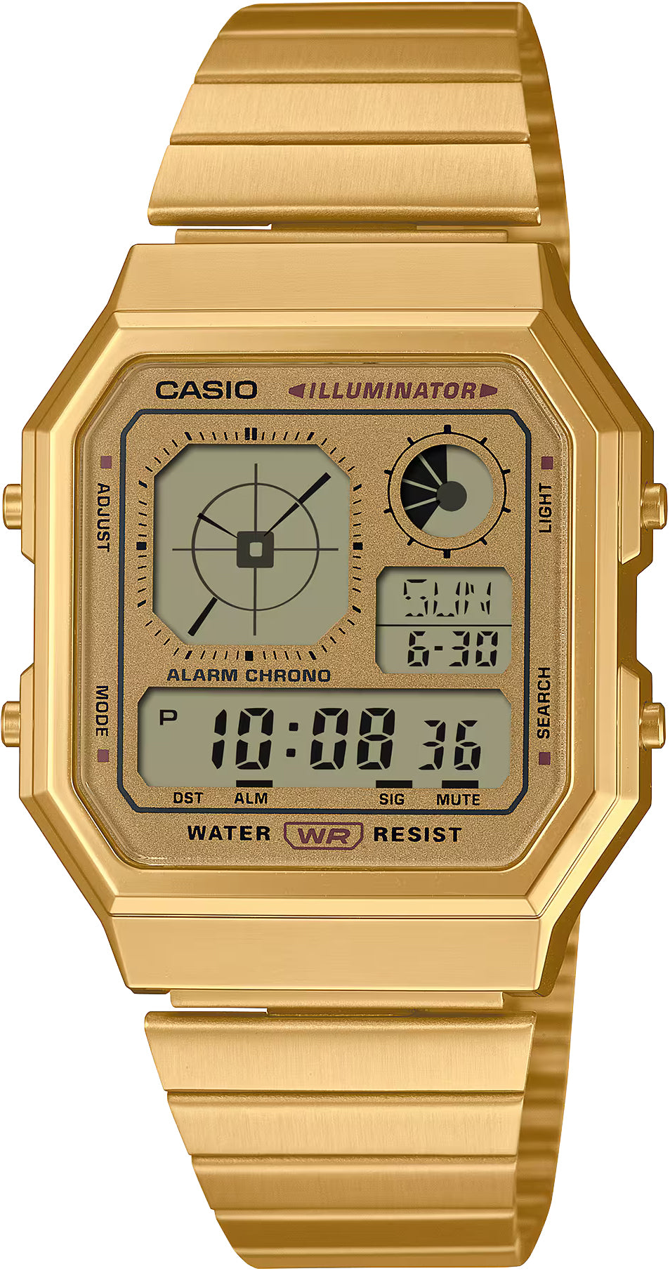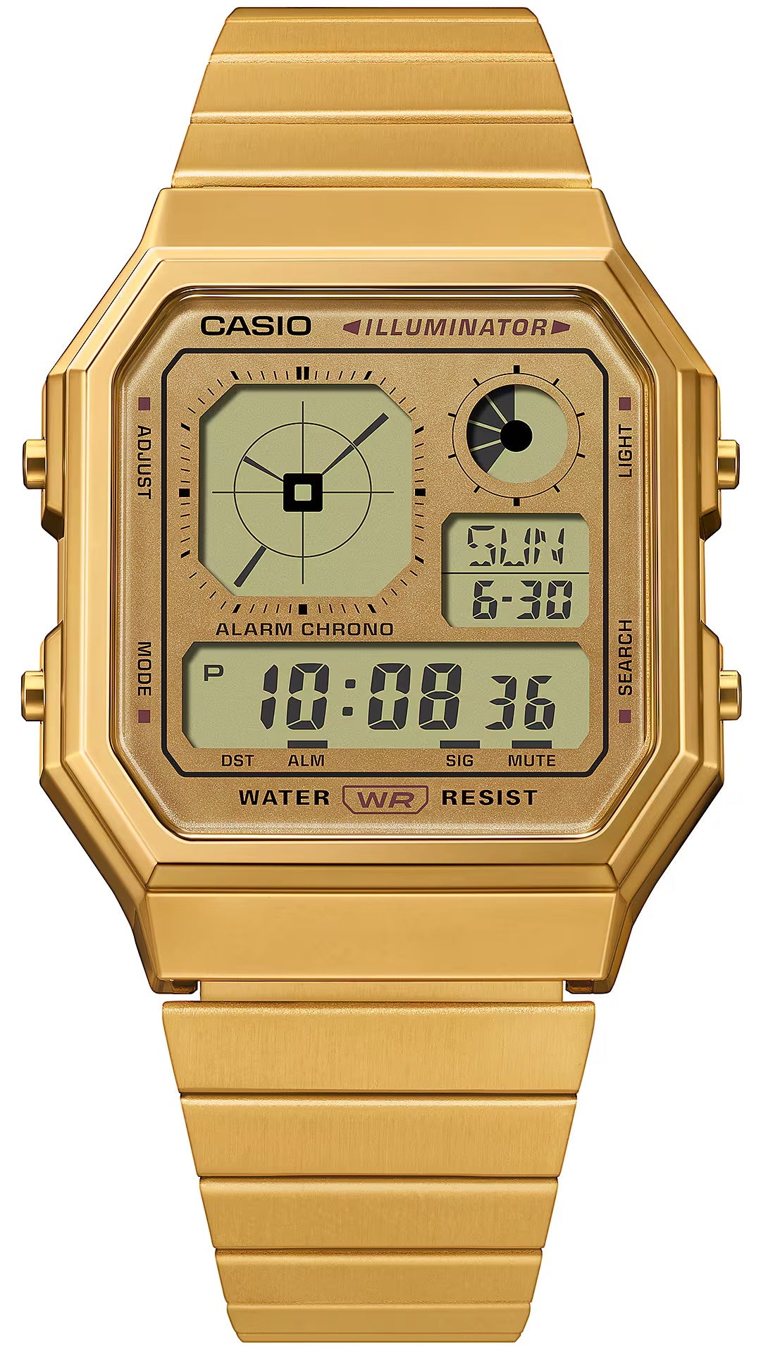 Casio Watch A130 Vintage A130WEG-9AEF. Step into the future with a nod to the past! With an updated take on the gadget-heavy aesthetics of the 1980s, blending a retro-futuristic vibe with analogue-inspired clock displays.