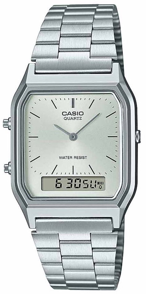 Casio Watch Vintage AQ-230A-7AMQYES. Casio’s vintage watch collection features a range of retro and timeless designs combining both aesthetics and functionality. The Casio vintage collection has a range of iconic and renowned timepieces, blending both colour and style, these retro watches are a popular choice for all tastes. Discover our iconic and vintage collection to further complement your style and everyday wear.