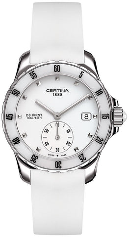 Certina Watch DS First Lady Ceramic Quartz. The ladies quartz models are as precise and reliable as the mens, with personalities ranging from the very sporty to the more classic and elegant. These watches are equally at home with evening wear, plain dress or in dramatic mountain bike descents. All feature high quality and durability in a dynamic design, thanks to a 316L stainless steel case, a sapphire crystal, water resistance up to a pressure of 10 bar and a proven ETA quartz movement.