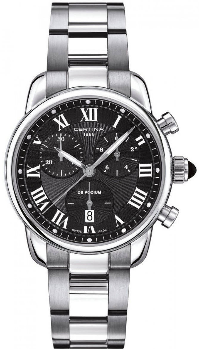 Certina Watch DS Podium Lady Chrono Quartz C025.217.11.058.00. The ladies quartz models are as precise and reliable as the mens, with personalities ranging from the very sporty to the more classic and elegant. These watches are equally at home with evening wear, plain dress or in dramatic mountain bike descents. All feature high quality and durability in a dynamic design, thanks to a 316L stainless steel case, a sapphire crystal, water resistance up to a pressure of 10 bar and a proven ETA quartz movement.