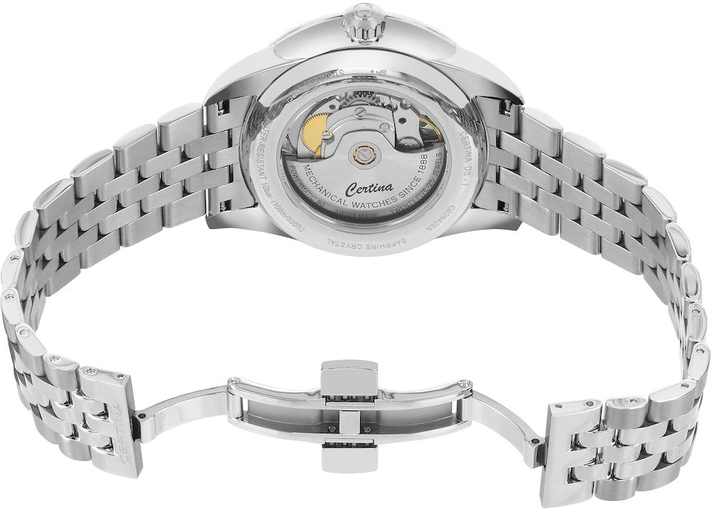 Certina Watch DS-1 Big Date C029.426.11.041.00. Timelessly elegant and sophisticated at once, the DS-1 Big Date easily unites alleged opposites. An understated color gradient lends character and depth to the domed, sunray finish dials. Dark blue darkens at the edges into black, while silver gray shades into anthracite. Facetted wedge indexes, long Dauphine hands and a big date at 6 o clock ensure absolute clarity. A sapphire crystal at the back of the 41mm stainless steel case provide maximum transparency. The watches are available with a precious stainless steel bracelet or calfskin leather strap, the latter is particularly easy to remove thanks to its quick release spring bars.