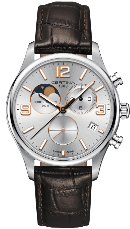 Certina Watch DS-8 Moon Phase C033.460.16.037.00. The moon phase, amongst the most classic complications in watchmaking, looks especially modern and minimalist on this chronograph. The COSC certified chronometer also boasts stylish colour combinations which beautifully accentuate its harmonious design.