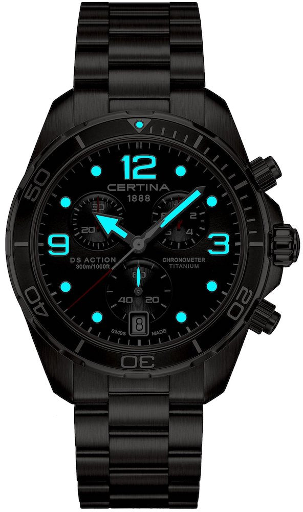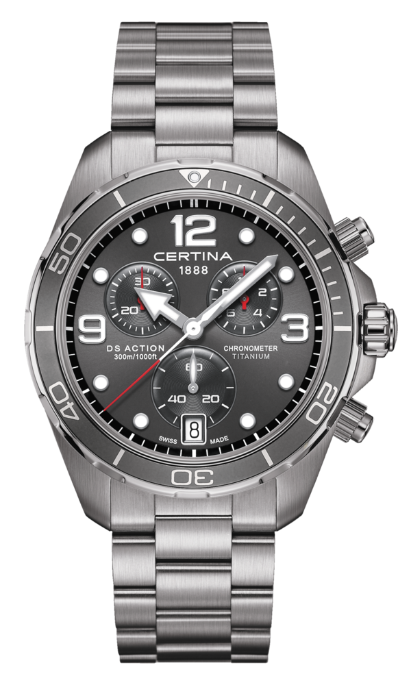 Certina Watch DS Action Titanium C032.434.44.087.00. This sporty chronograph, featuring a unidirectional aluminium bezel, never backs down from a challenge. After all, wearers of this COSC certified quartz chronometer will be keeping track of time with the utmost precision. Alongside outstanding accuracy, its water resistance up to 30 bar and robust design make it a real force to be reckoned with.