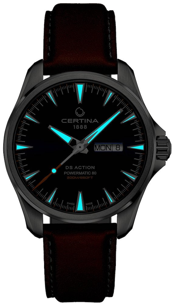Certina Watch DS Action Day Date Powermatic 80 C032.430.16.041.00. Life is full of surprises. The DS Action Day Date Powermatic 80 is equipped to tackle each and every one of them. Offering water resistance to 20 bar, an ultra modern automatic calibre and the coveted time and date display, this timepiece is sporty and elegant in equal measure.
