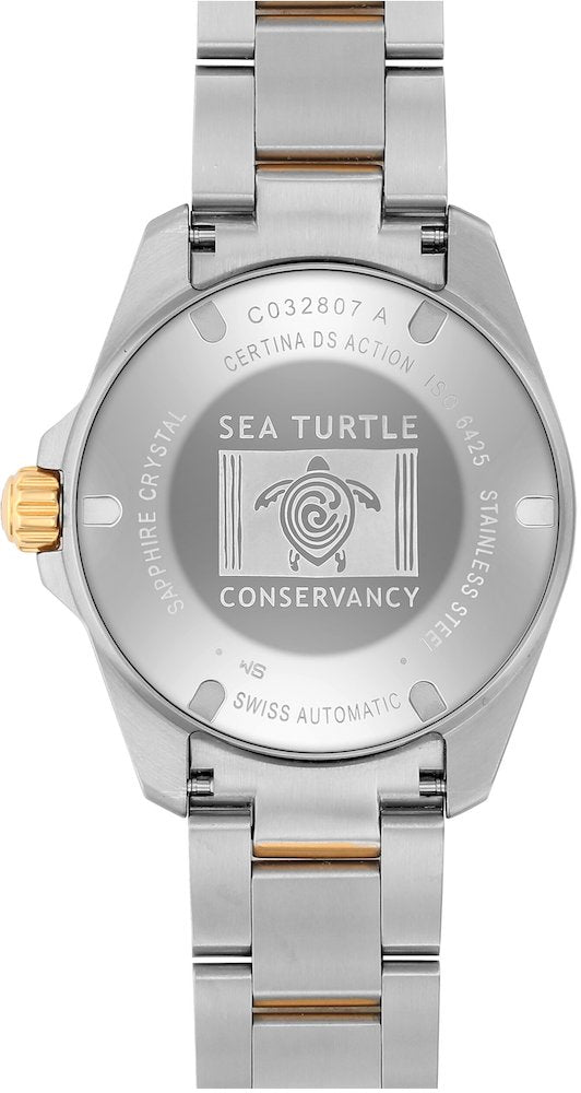 Certina Watch DS Action Diver Sea Turtle Conservancy Special Edition C032.807.22.041.10. The Certina watches DS Action Diver has long been a favourite among admirers of the Certina collection. The 38 mm version looks stunning on every wrist and shows off its exceptional quality and contemporary, compact design.