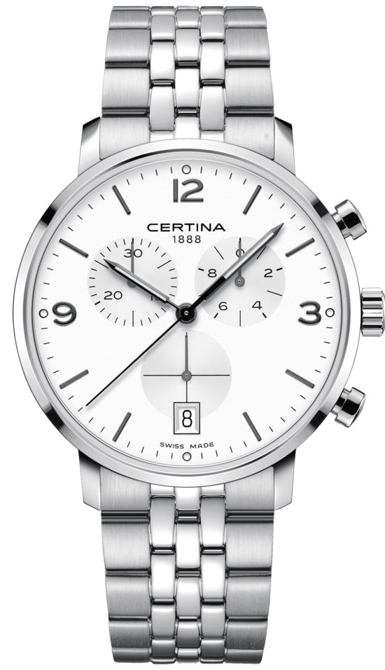 Certina Watch DS Caimano Chronograph C035.417.11.037.00. With its simple and modern design, the DS Caimano Chronograph shows how beautifully elegant precision timing can be. Premium steel bracelets or fashionable leather straps featuring a quick-change system complete the contemporary look.