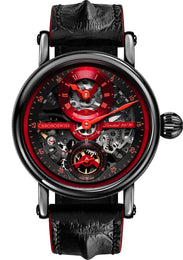 The powerhouse to the Chronoswiss Flying Grand Regulator Skeleton watch is the Calibre C.677S manual movement. Spotted through the exhibition case back, the movement delivers 17 jewels, a skeletonised plate and bridges, skeletonised gear trains and thermally blued screws. The Swiss made calibre also guarantees a power reserve of 46 hours and a frequency of 18,000 vibrations per hour. The movement is protected within a 44 millimetre case engineered from black DLC coated stainless steel with curved sapphire crystal glass treated with anti-reflective coating, a screw down bezel and a satin-finished onion-shaped crown water resistant to 30 metres. To match the black and red dial, the Chronoswiss Regulator Skeleton watch is paired with a hand-sewn Hornback crocodile leather strap in black with vivid red stitching and a black PVD folding buckle.
