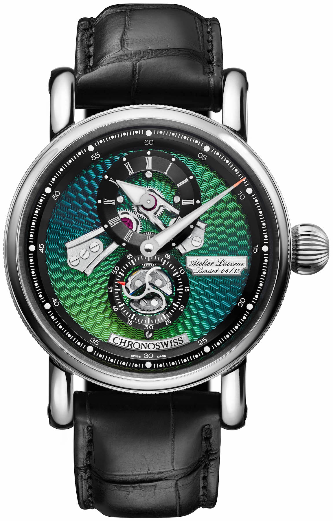 If there’s one luxury watch design that Chronoswiss have mastered, it’s the Regulator, a design which sees the three main indicators of hours, minutes and seconds delivered off-centre on their own unique subsidiary dial. With this Chronoswiss Flying Regulator Open Gear Limited Edition watch, the Swiss watch manufacturer continues their legacy with a new play on the Regulator theme, placing it with several skeletonised apertures. The elaborate two levelled dial features screwed on skeletonised train wheel bridges and funnel-like constructions in black for the hours and seconds display. Meanwhile, the Trigono-shaped minutes hand sits centre stage in silver on an ocean coloured hand-guilloched backdrop treated to a helping of Superluminova.
