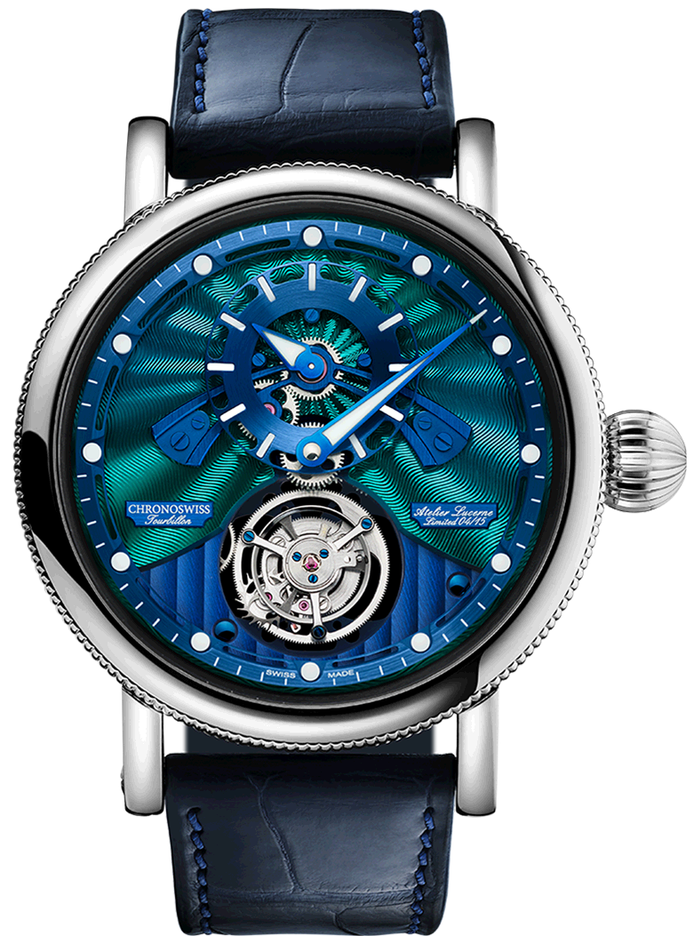 Chronoswiss Watch Open Gear Flying Tourbillon Paraiba Limited Edition CH-3123-PABL. The Chronoswiss Open Gear Flying Tourbillon has a unique 3D regulator set-up and a hypnotizing handmade guilloche that comes in 3 different patterns and makes you question common design rules. The half skeletonized flying tourbillon is completely designed with in house, at the atelier in Lucerne.