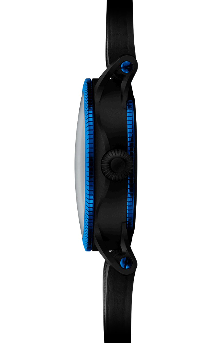 - Black skeletonised dial with vibrant azure blue accents