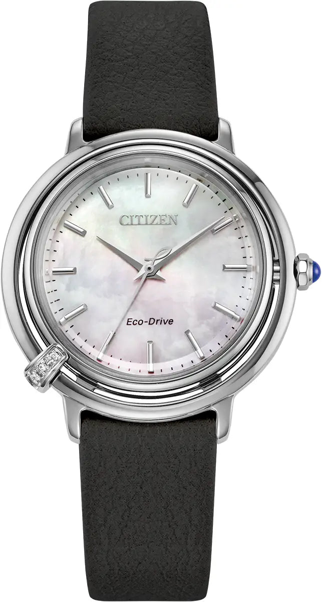 Citizen Watch Citizen L Arcly Ladies EM1090-60D. Classic lines and hints of romance make this newest piece to our women’s collection, the Citizen L Arcly, a glamorous addition of sustainable luxury. With a design inspired and celebrating the 10th anniversary of the first Citizen L “Sunrise, the distinctive silver-tone stainless steel timepiece is a charming accent on the wrist that’s perfect for everyday wear with a hint of sparkle. Sleek lines define the watch's 31mm silhouette, with a subtle crown and small diamond accent adding to its captivatingly delicate look; a black interchangeable apple leather strap adds to its daily versatility. On the mother-of-pearl dial, applied markers and sharp hands indicate the time in style. Sustainably powered by any light with our proprietary Eco-Drive technology that never needs a battery, this elegant women’s watch is the perfect addition to any look. Water resistant to 50 metres.