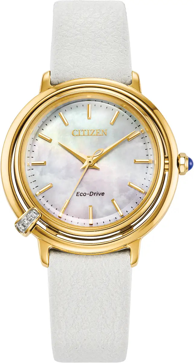 Citizen Watch Citizen L Arcly Ladies EM1092-64D. Classic lines and hints of romance make this newest piece to our women’s collection, the Citizen L Arcly, a glamorous addition of sustainable luxury. With a design inspired and celebrating the 10th anniversary of the first Citizen L "Sunrise, the distinctive gold-tone stainless steel timepiece is a charming accent on the wrist that’s perfect for everyday wear with a hint of sparkle. Sleek lines define the watch's 31mm silhouette, with a subtle crown and small diamond accent adding to its captivatingly delicate look; a white interchangeable apple leather strap adds to its daily versatility. On the mother-of-pearl dial, applied markers and sharp hands indicate the time in style. Sustainably powered by any light with our proprietary Eco-Drive technology that never needs a battery, this elegant women’s watch is the perfect addition to any look. Water resistant to 50 metres.