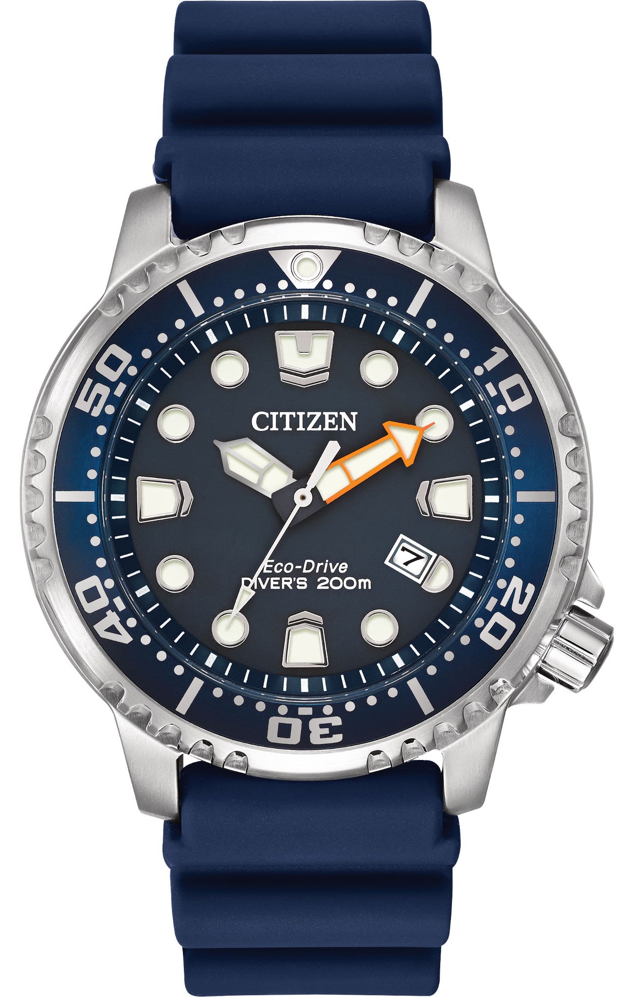 Citizen Watch Eco Drive Divers WR200 Mens BN0151-09L. Prove that a dive watch can be fun & functional with the Citizen ISO certified Promaster Professional Diver. With Eco Drive technology, it is powered by light and never needs a battery, so you will never need to open your caseback or compromise your dive again. Featured with stainless steel case, dark blue polyurethane strap and dark blue dial. With aluminum ring on bezel, one way rotating elapsed time and WR200.