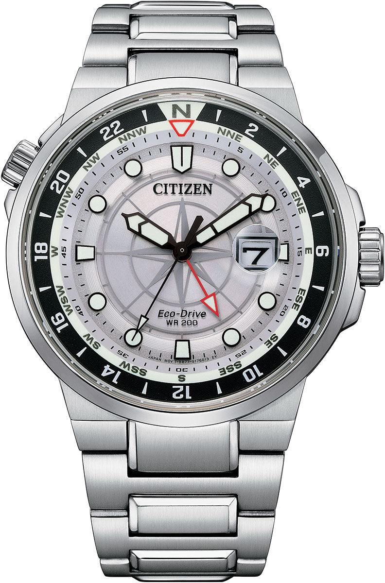 Citizen Watch Eco Drive Promaster GMT Mens Color. Venture into our new sport collection with the Endeavor timepiece for next level style and function. The updated design in stainless steel features a 4-hand white dial with a dual time zone and magnified date, an inner rotating compass ring bezel, luminous hands and markers, and an anti-reflective sapphire crystal. This timepiece also features a fold-over clasp closure with hidden push buttons and is water resistant to 200 metres. For a mens watch that makes a standout style statement, the Endeavor is the perfect choice. Featuring our proprietary Eco-Drive technology sustainably powered by any light and never needs a battery.