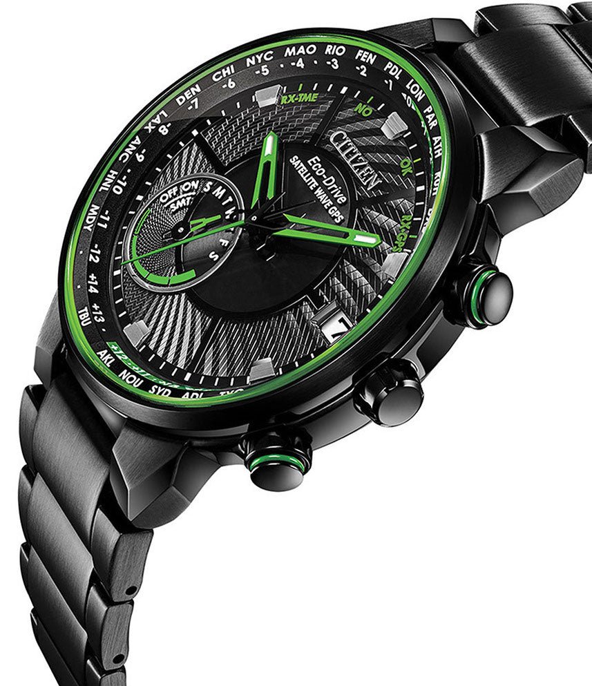Citizen Watch Eco Drive Satellite Wave GPS Mens Color. Bolder and brighter. Enhanced technical and architectural design; the Citizen Satellite Wave GPS is the leader of the pack with the world's fastest timekeeping signal reception speed from GPS navigation. A sleek Black Ion Plated stainless steel case and bracelet, black dial and brilliant green accents featured satellite GPS timekeeping technology with worldwide reception and time adjustment in 40 time zones. Powered by Citizen Eco-Drive technology powered by light, any light. Never needs a battery.
