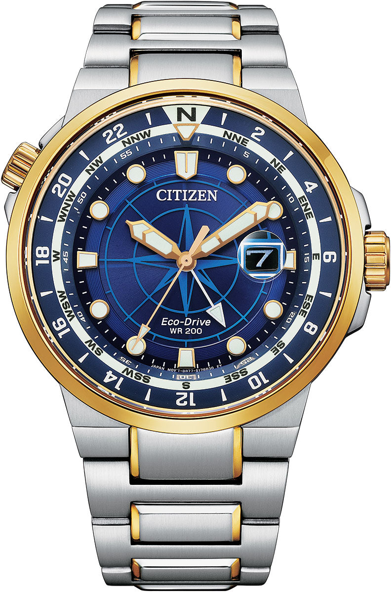 Citizen Watch Eco Drive Sport Color. Venture into our new sport collection with the Endeavor timepiece for next level style and function. The updated design in two-tone stainless steel features a 3-hand blue dial with a dual time zone and magnified date, luminous hands and markers, and an anti-reflective sapphire crystal. This timepiece also features a fold-over clasp closure with hidden push buttons and is water resistant to 200 metres. For a mens watch that makes a standout style statement, the Endeavor is the perfect choice. Featuring our proprietary Eco-Drive technology sustainably powered by any light and never needs a battery.